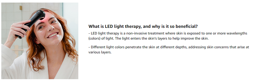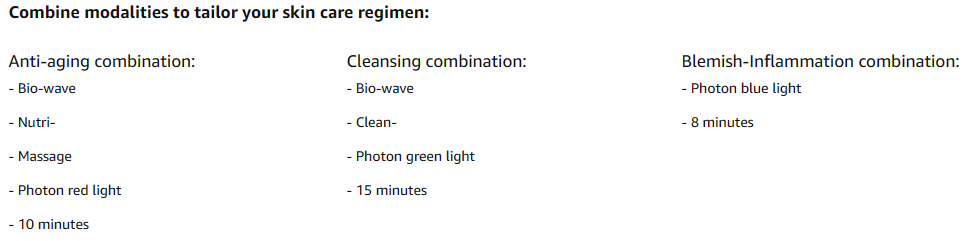 · LED Photonic Light Therapy: red, blue and green light modes, to address aging, blemish, and pigmentation concerns