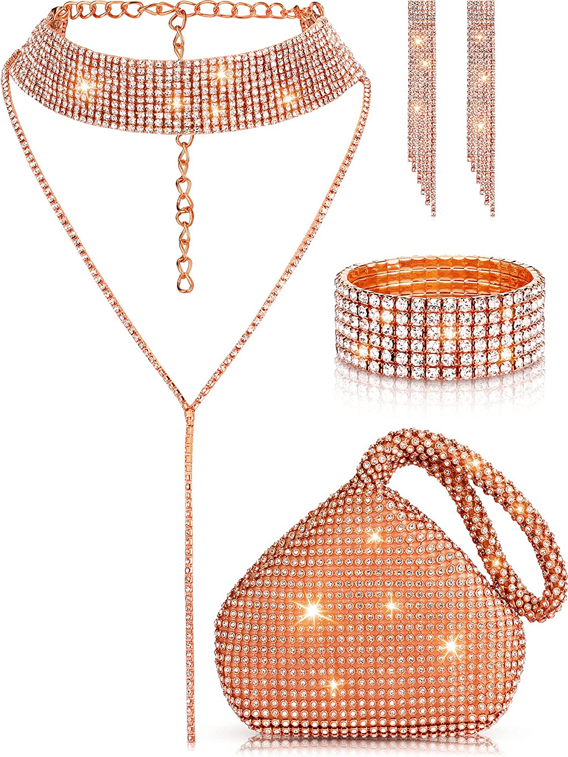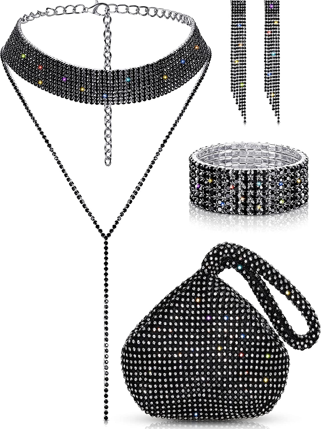 The bling rhinestone jewelry set and crystal evening handbag are adorable and exquisite, which not only help you create stylish and charming gifts, and the evening bag also can help you store your necessities, such as lipstick, tissue paper, lip balm and keys.