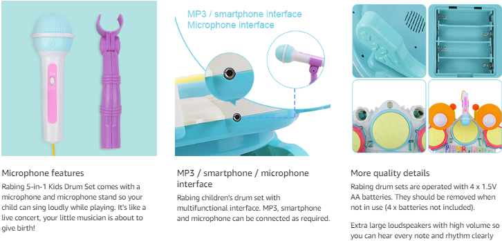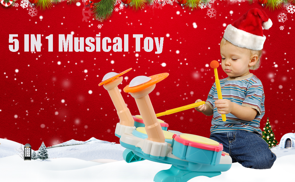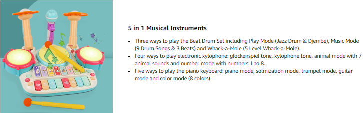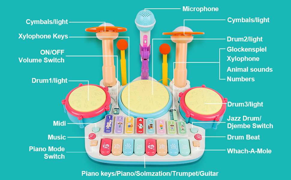 5 in 1 Musical Instruments Toy- Three Ways to Play Beat Drum Set, including Play mode (Jazz drum & Djembe), Music mode (9 drum songs & 3 beats), and Whack-a-mole (5 level whack-a-mole game with different difficulty). Four Ways to Play Electronic Xylophone: Glockenspiel tone, Xylophone tone, Animal mode with 7 animals sounds, and Number mode that says numbers 1 through 8. Five Ways to Play Piano Keyboard: Piano mode, Solmization mode, Trumpet mode, Guitar mode, and Color mode (8 colors)