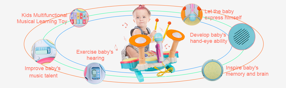 Early Music Education Toy for Kids- Our Toddler Drum & Piano Set is a perfect learning music toy for little musicians, which increases your kid's interest in music, enhances your baby's eye-hand coordination and develops fine motor skills and auditory sensory by hitting drum and playing the piano keyboard