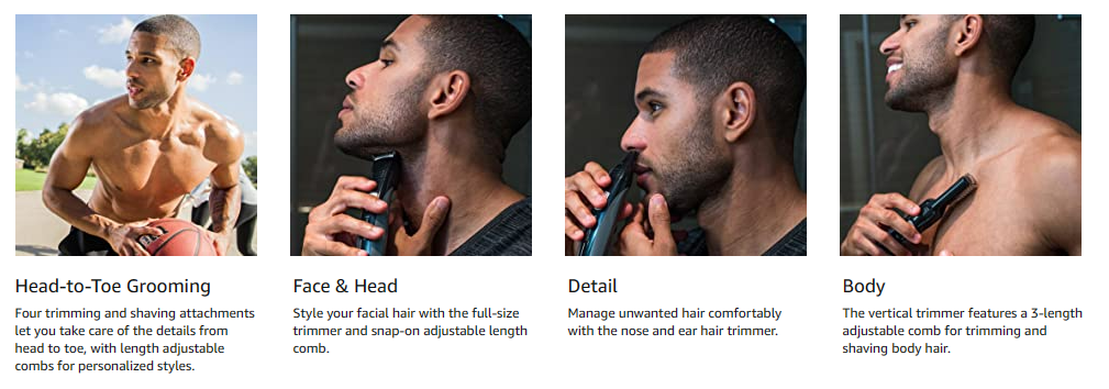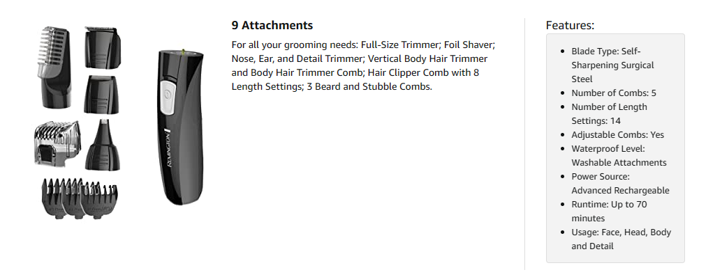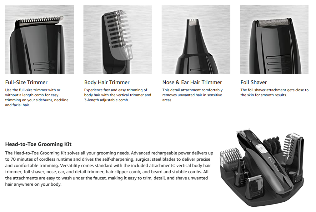 The Remington PG526 Advanced Rechargeable Power Series Head-To-Toe Grooming Kit solves all your grooming needs. The lithium battery inside the rechargeable power base drives the self-sharpening, surgical steel blades to deliver precise and comfortable trimming. Each full charge delivers 70 minutes of cordless use. Versatility comes standard with the included attachments: vertical body hair trimmer; foil shaver; nose, ear, and detail trimmer; hair clipper comb; and beard and stubble combs. All the attachments are easy to wash under the faucet, making it even easier to trim, detail, and shave unwanted hair anywhere on your body. Voltage- 120 VAC 60Hz.
