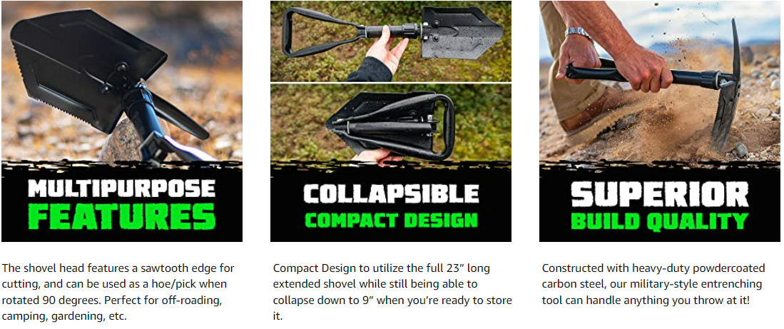 Folding survival shovel w/ pick - heavy duty carbon steel military style entrenching tool for off road, camping, gardening, beach, digging dirt, sand, mud & snow.