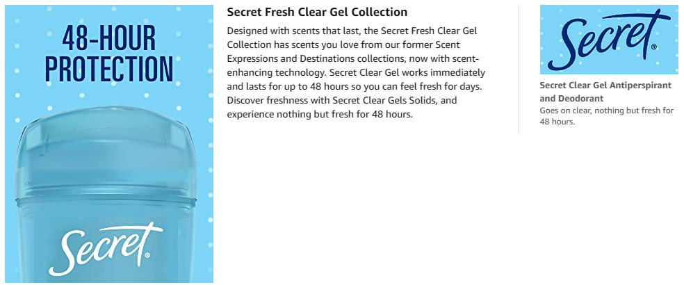 Designed with scents that last, the Secret Fresh Collection has scents you love. Secret Antipirspirant and Deodorant for Women Fresh Clear Gel immediately fights odor and provides 48-hour sweat and odor protection, helping you stay fresh and confident day in and day out. Secret’s unique clear gel formula goes on clear, dries fast, and provides a burst of freshness that lasts all day long. Secret Fresh Clear Gel with pH Balancing Minerals is nothing but fresh for 48 hours.