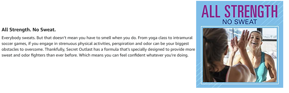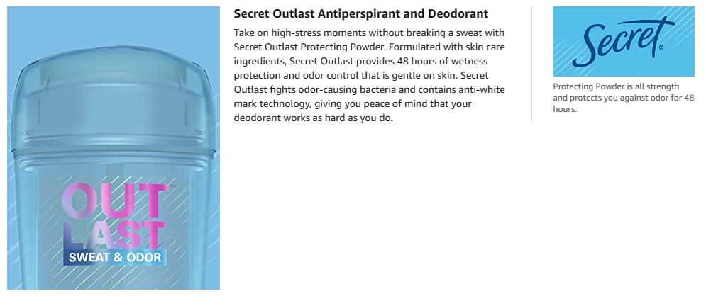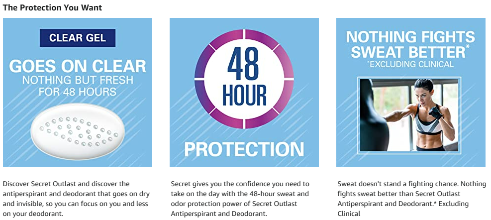 Sweat is the last thing you need to be worried about. Take one worry off of your plate first thing in the morning. With a couple quick swipes, you'll have confidence all day. Secret Outlast fights sweat better* so you get all strength and no sweat for 48 hours. Clear Gel goes on clear for no white marks. When you use Secret, you're getting the peace of mind that your deodorant will work as hard as you do. *Vs. Leading invisible solid