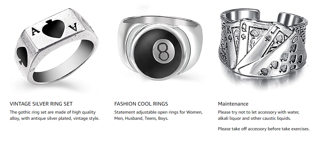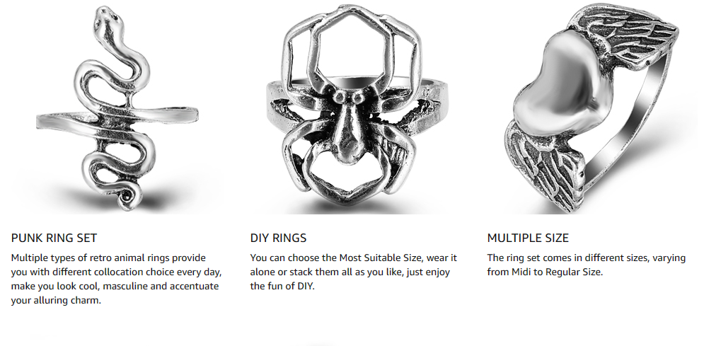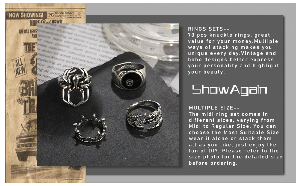 • ✿COOL PUNK RING PACK✿: These rings set comes in many different styles, include snake, mushroom, feather, butterflies, roses, star, flower, spade ace, Chinese dragon ring, heart and so on...The unique design jewelry is very suitable for those who have a changeable daily style, make you look cool, masculine and accentuate your alluring charm.Bonus points for your overall styling.If you are punk or retro Gothic style rings lover, you're gonna love this ring set!