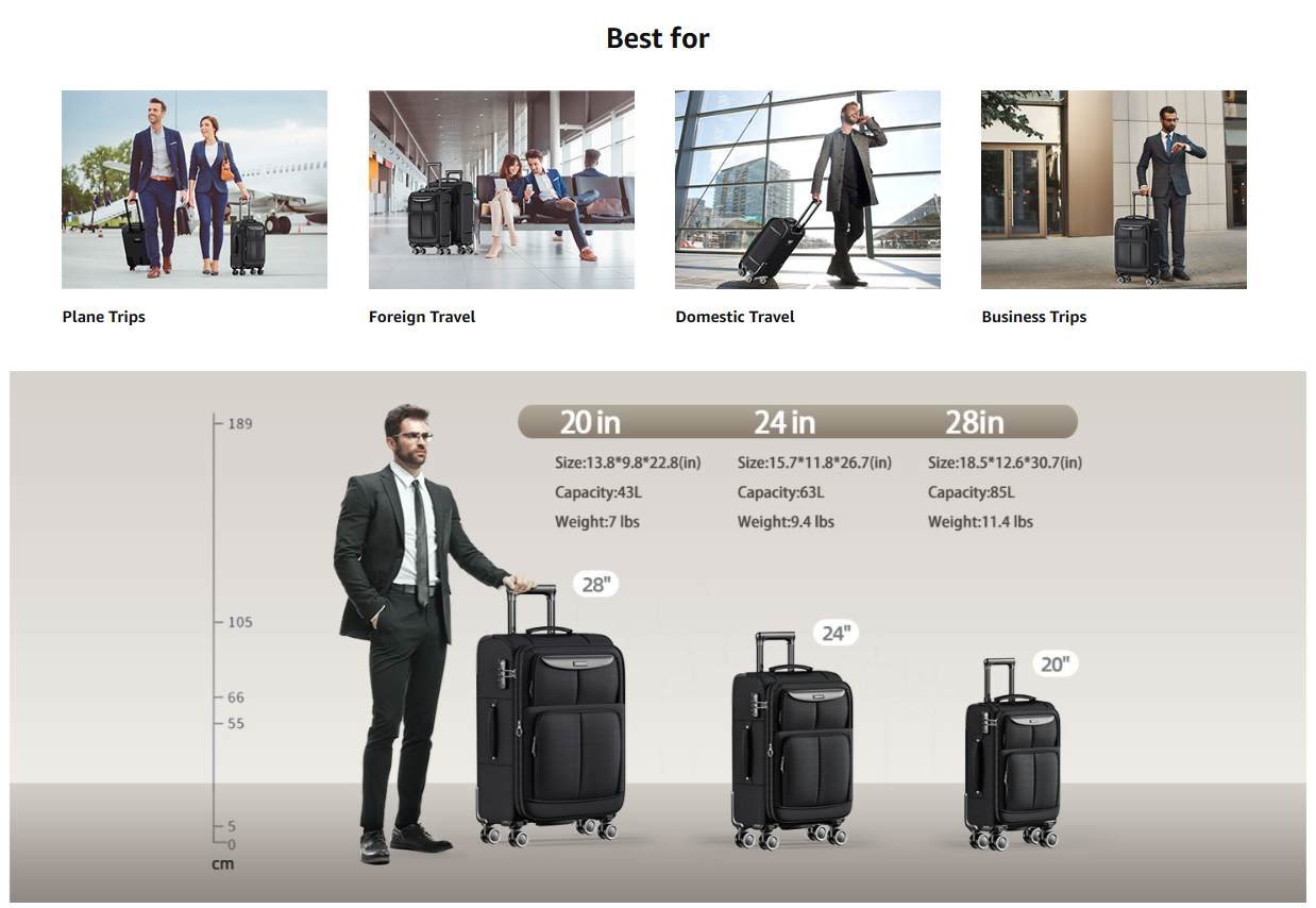 • Top Softside Luggage Sets: Made of high-density oxford fabric, resists stains and waterproof, high abrasion resistance to keep the softside softshell luggage beautiful. 20 inch is the most suitable to carry around, 24in & 28in can expand 20% of the increase space. Capacity: 20in43L 24in63L 28in 85L.