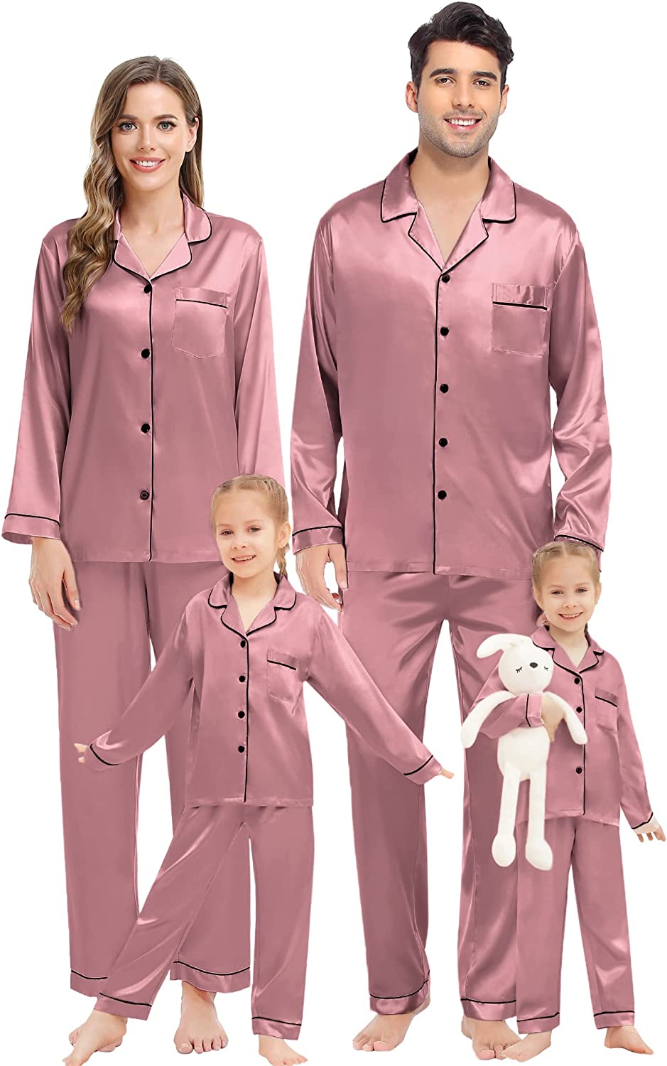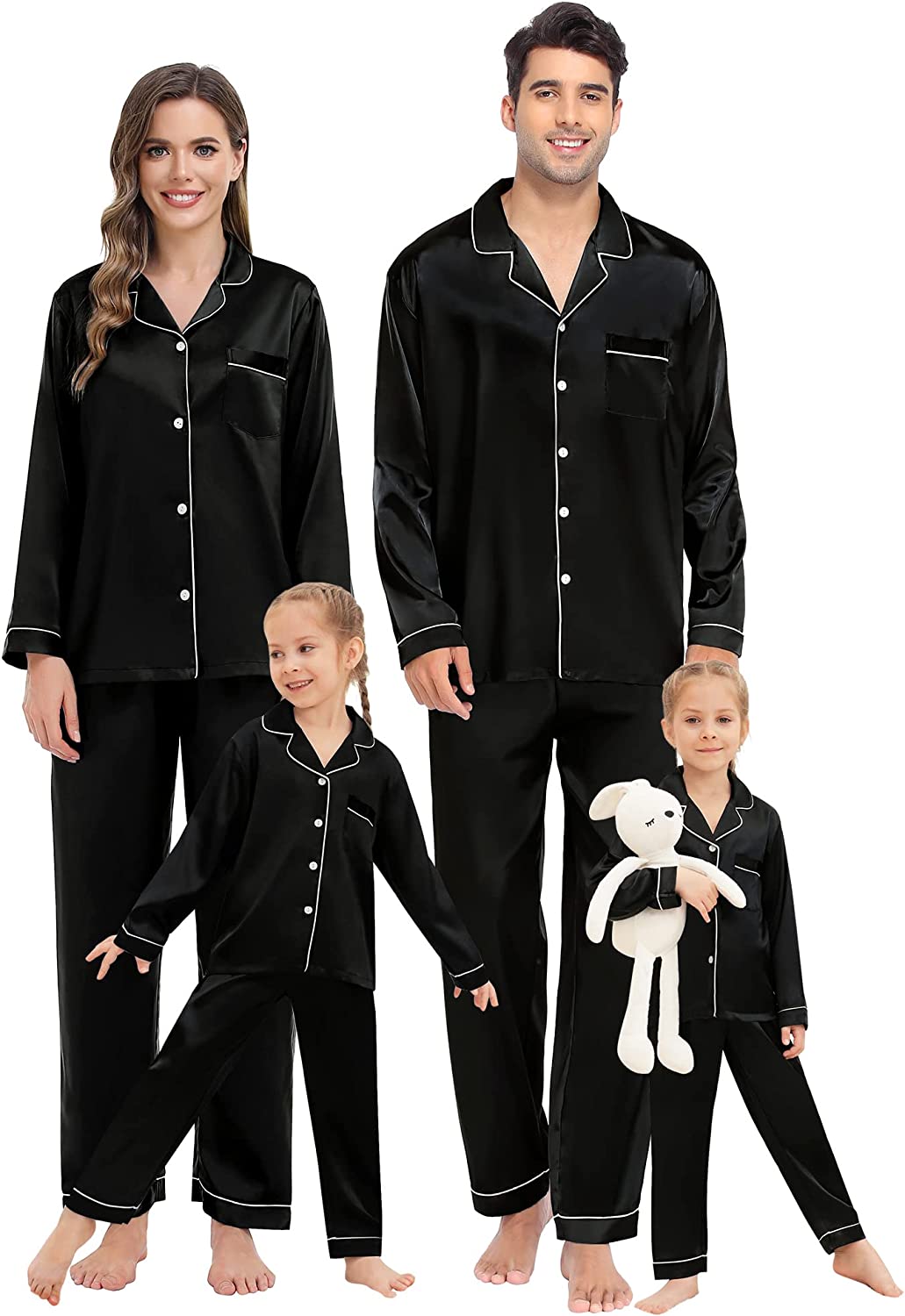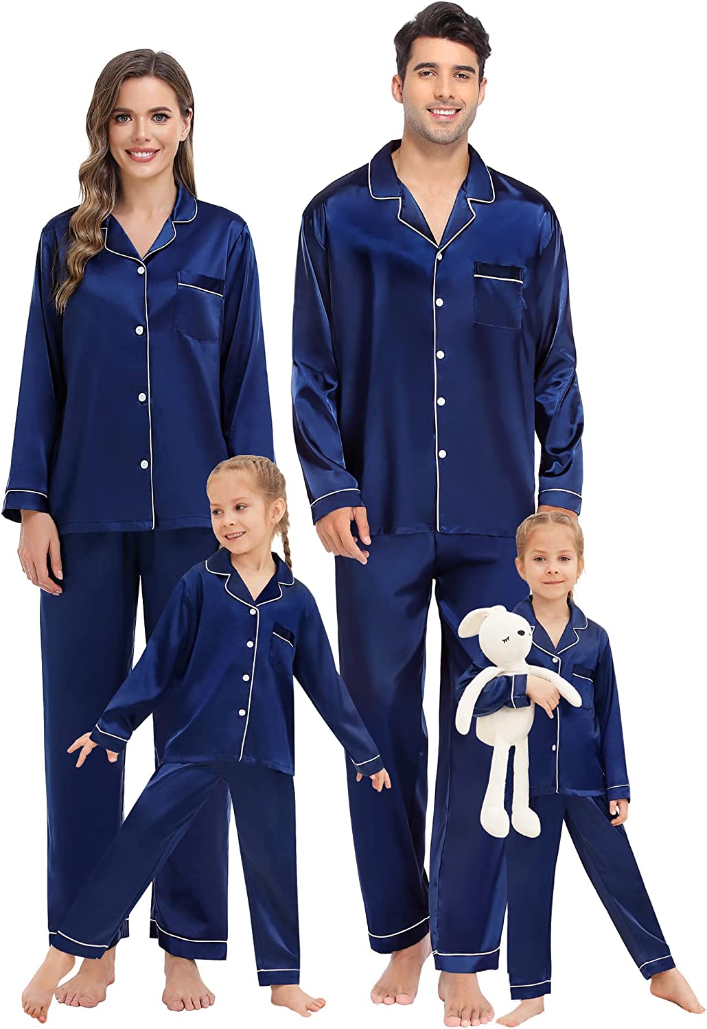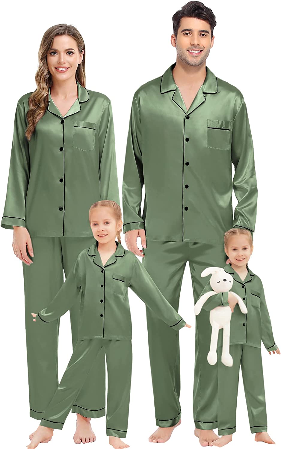 SWOMOG Christmas Family Matching Pajamas Long Sleeve Pj Set Warm Sleepwear Button Down Silk Family Pajamas