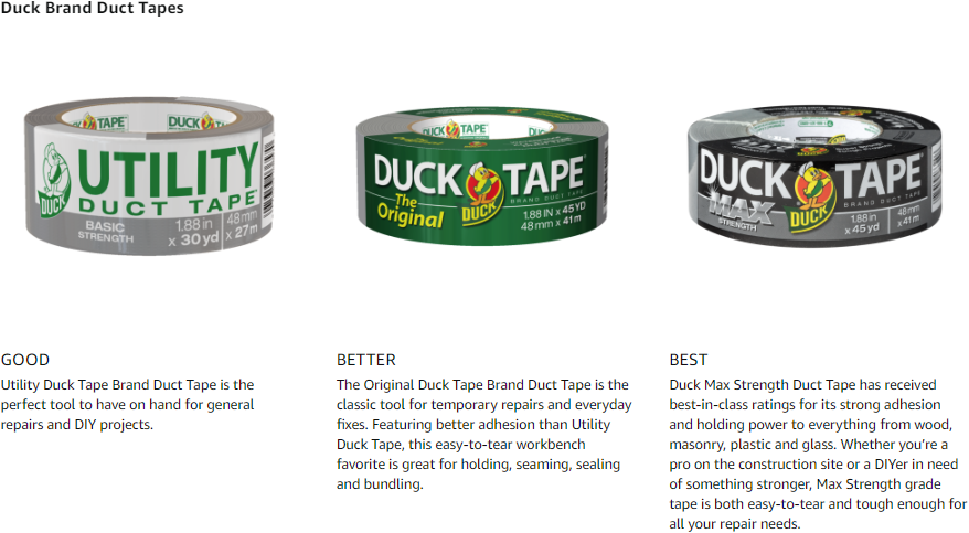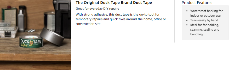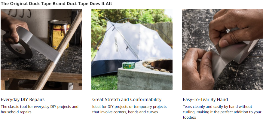 The Original Duck Tape Brand Duct Tape is the classic tool for temporary repairs and everyday fixes. Featuring strong adhesion, this hand tearable duct tape is a workbench favorite and is great for holding, seaming, sealing and bundling. Its strength and conformability makes this tape ideal for those difficult DIY projects that involve corners, bends and curves. With its wide variety of uses around the home or office, Original grade tape is the perfect tool to have on hand.