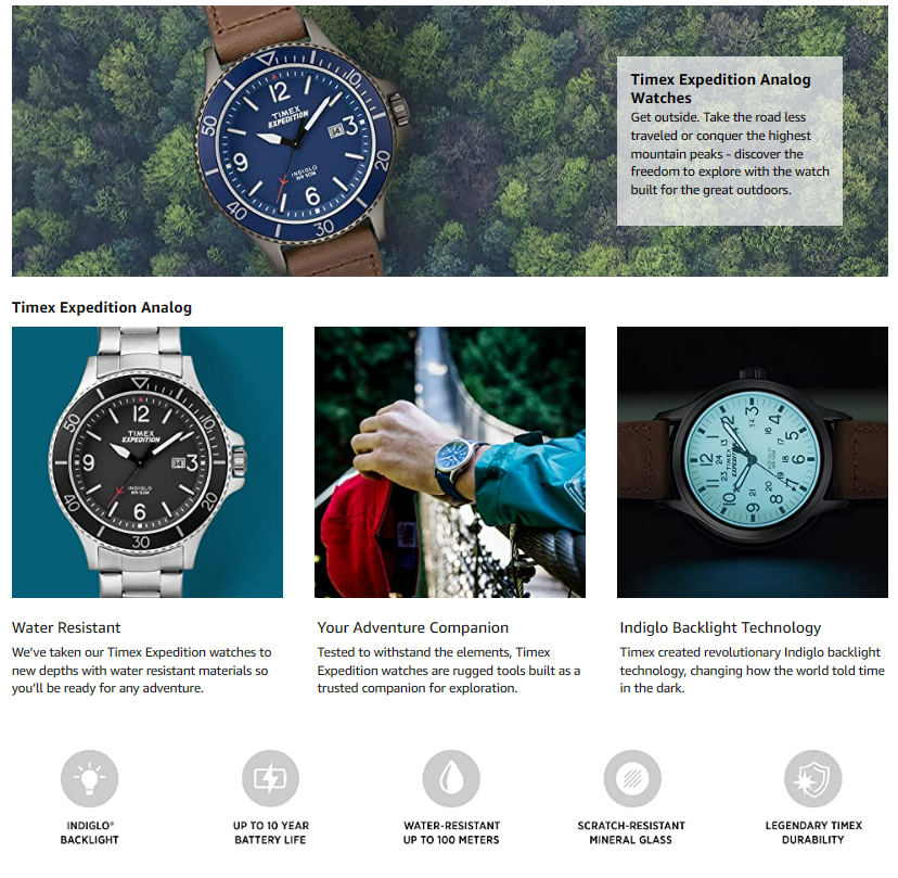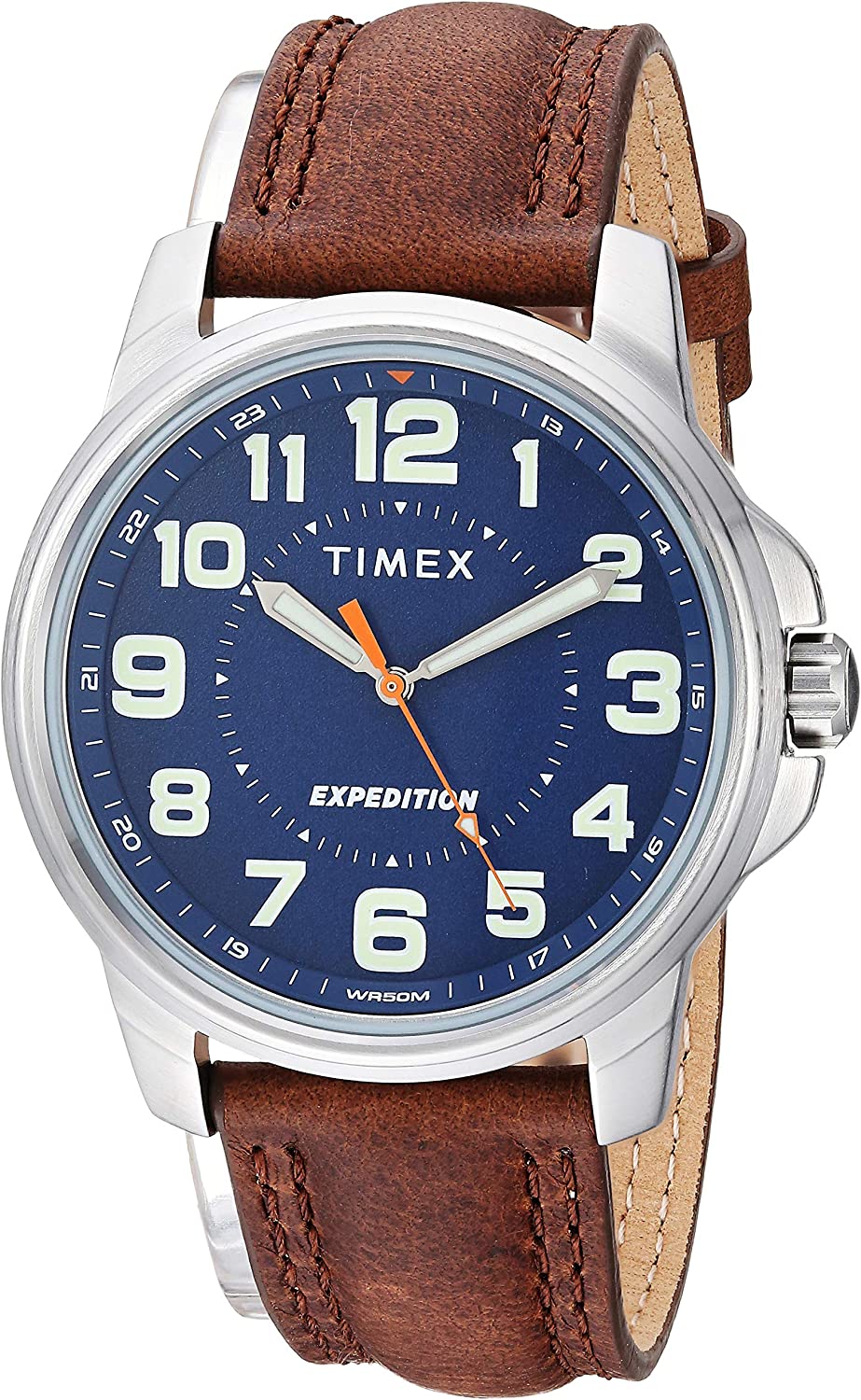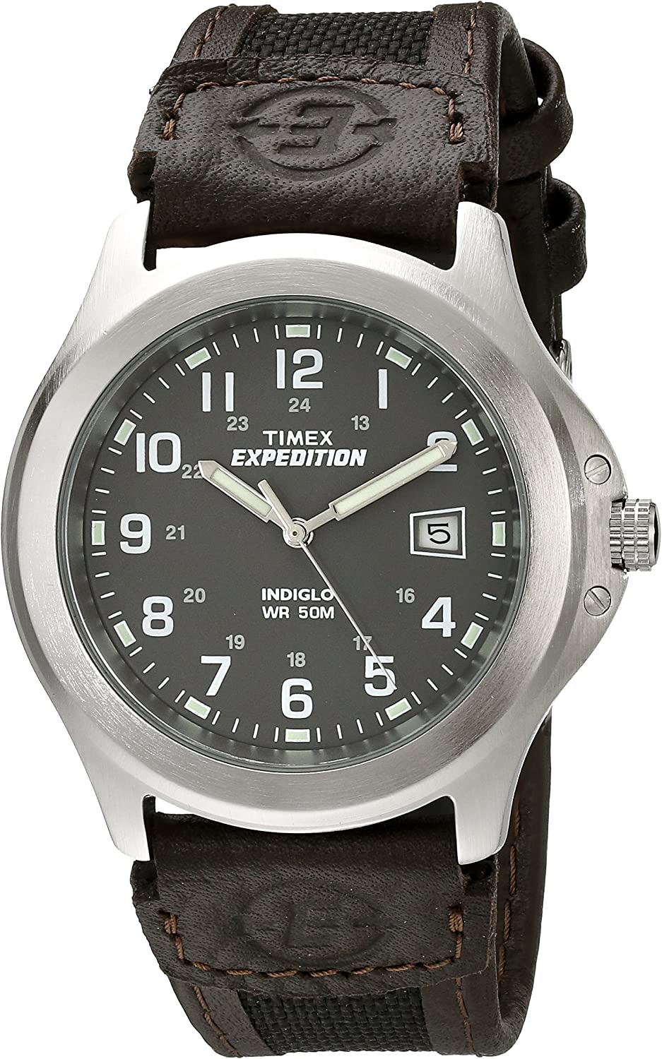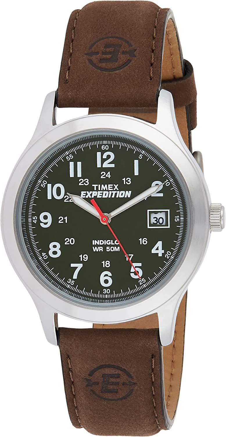 "While it looks like a casual watch, the full-sized Timex Men's T40051 Expedition Metal Field Brown Leather Strap Watch adds a stylish yet rugged complement to your everyday wear. It features a large, round silver-tone brass watch case with a flattened, brushed bezel that frames an olive green dial background with Arabic numerals, inset 24-hour notations, large, luminous stick hands (with seconds hand), and a date display at 3 o'clock. With the Quick Date function, you can set the date on the watch without turning the crown for every 24-hour period. Just pull the stem halfway out, and turn until desired date is reached. It also offers an 8-year battery life, water resistance to 165 feet (50 meters), and a durable genuine leather strap. The Indiglo night-light uniformly lights the surface of the watch dial using patented blue electroluminescent lighting technology. It uses less battery power than most other watch illumination systems, enabling your watch battery to last longer."