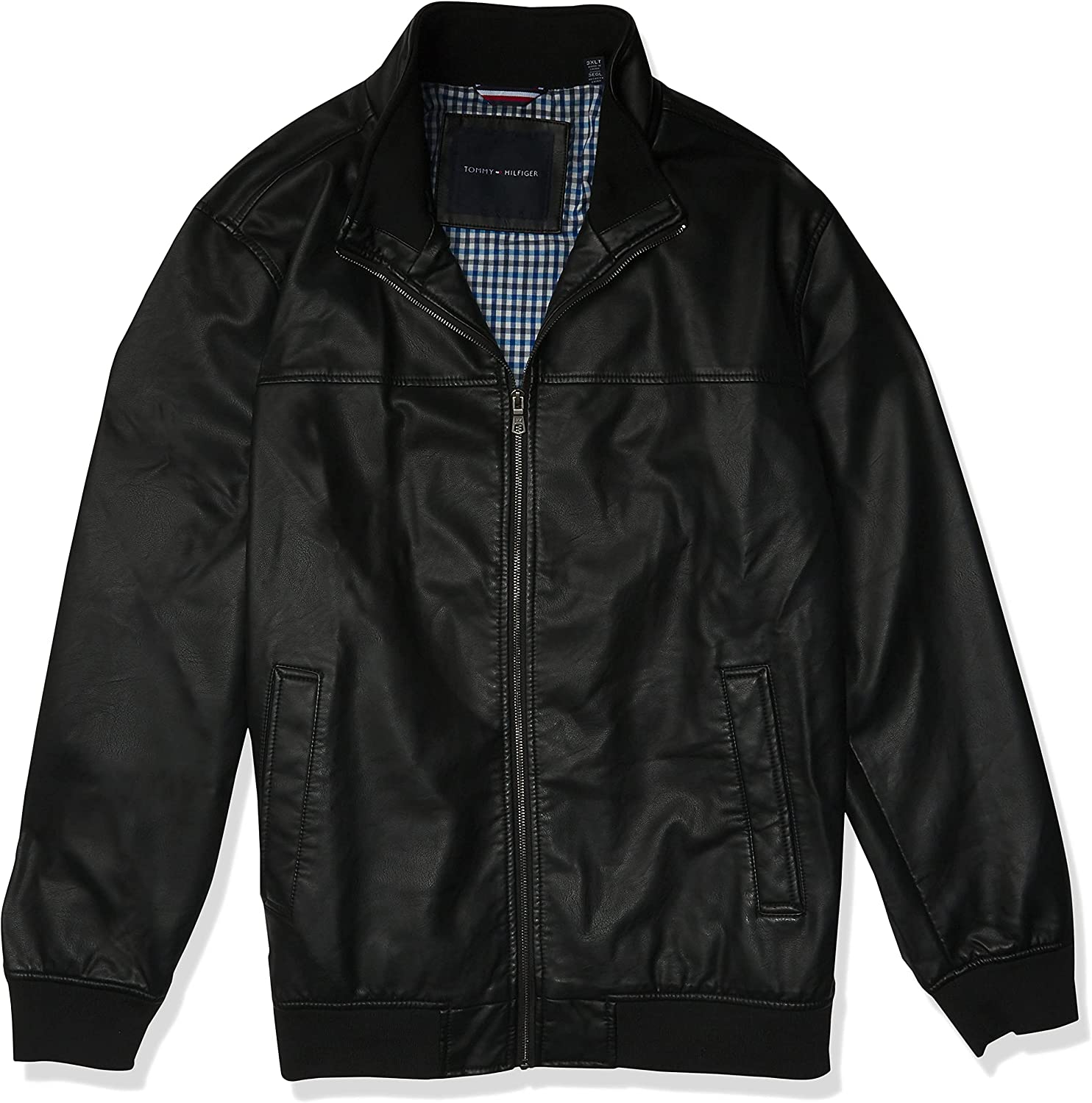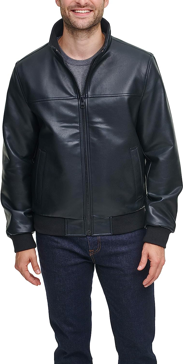 Smooth lamb touch faux leather stand collar bomber jacket. Center front zipper closure.