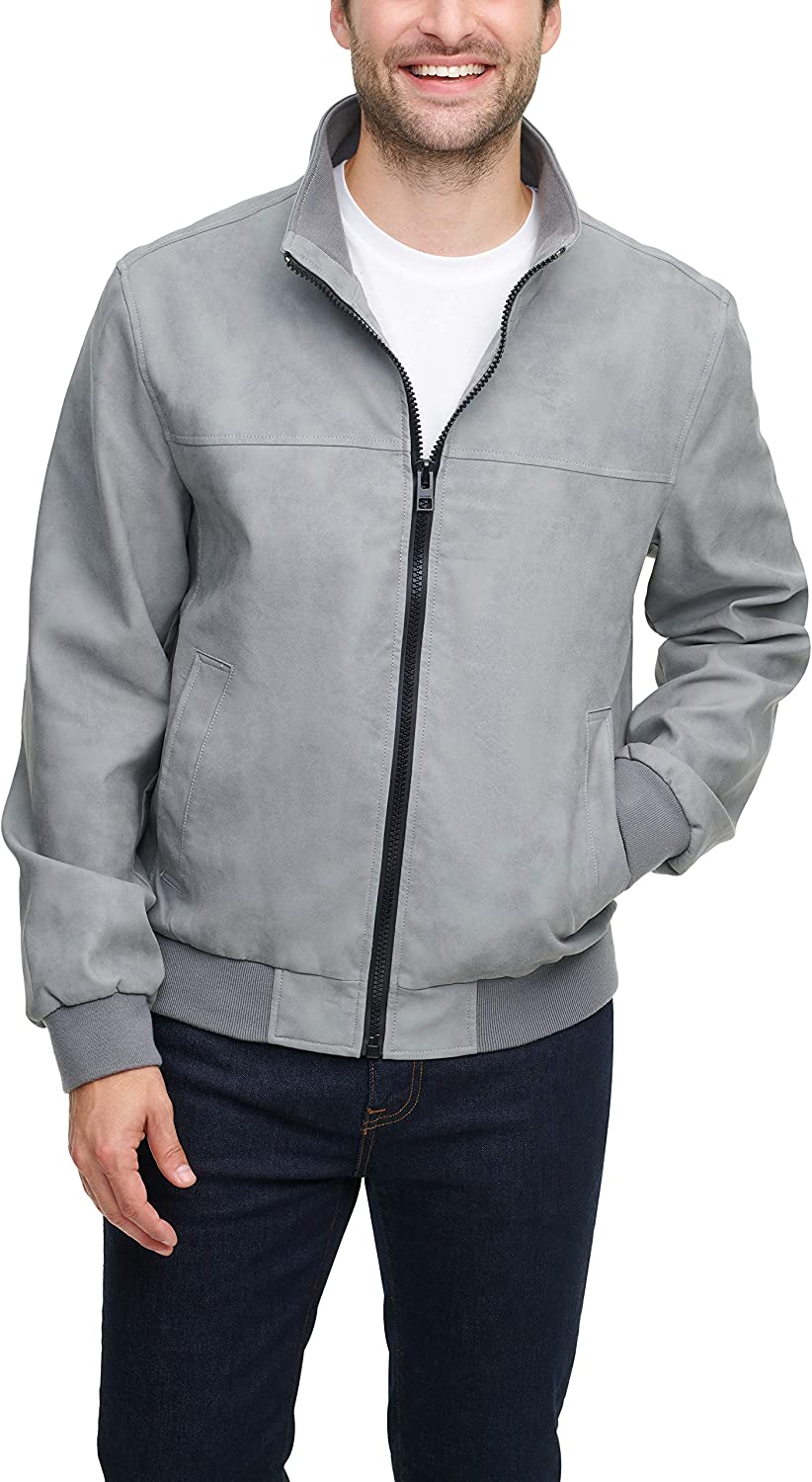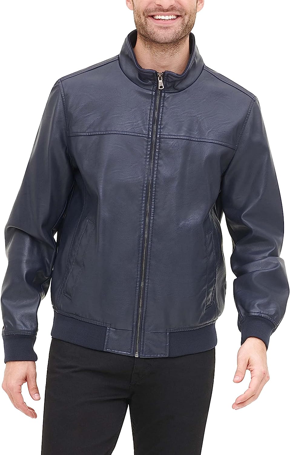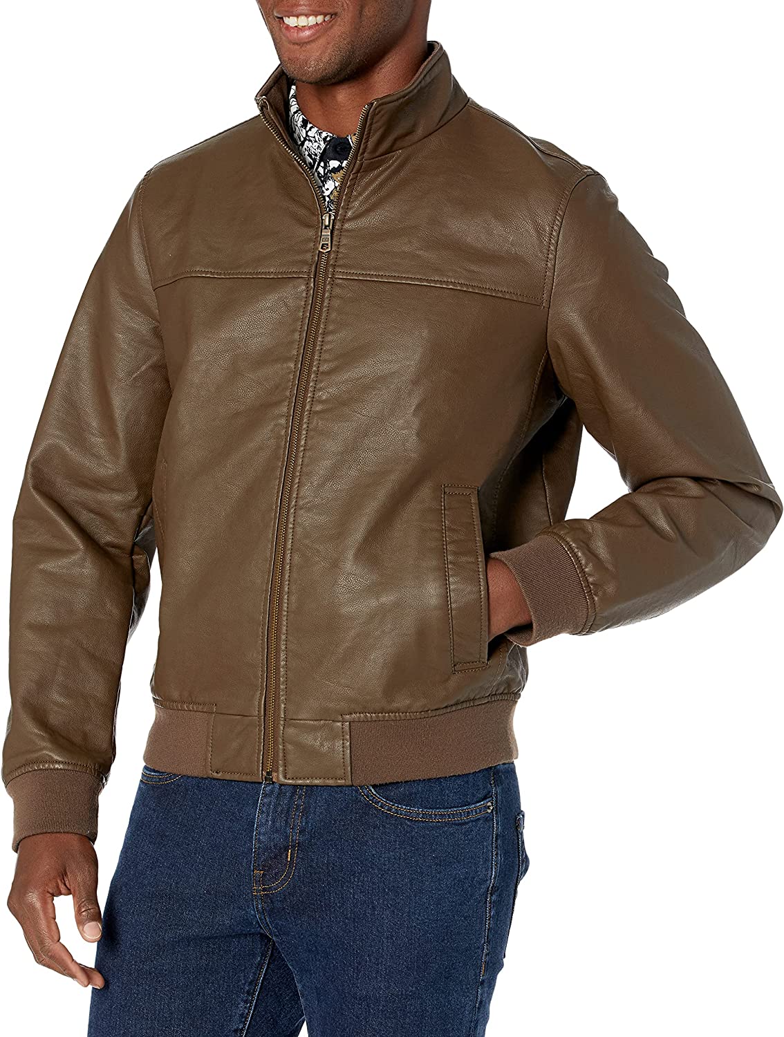 Smooth lamb touch faux leather stand collar bomber jacket. Center front zipper closure.