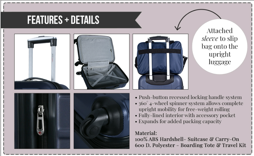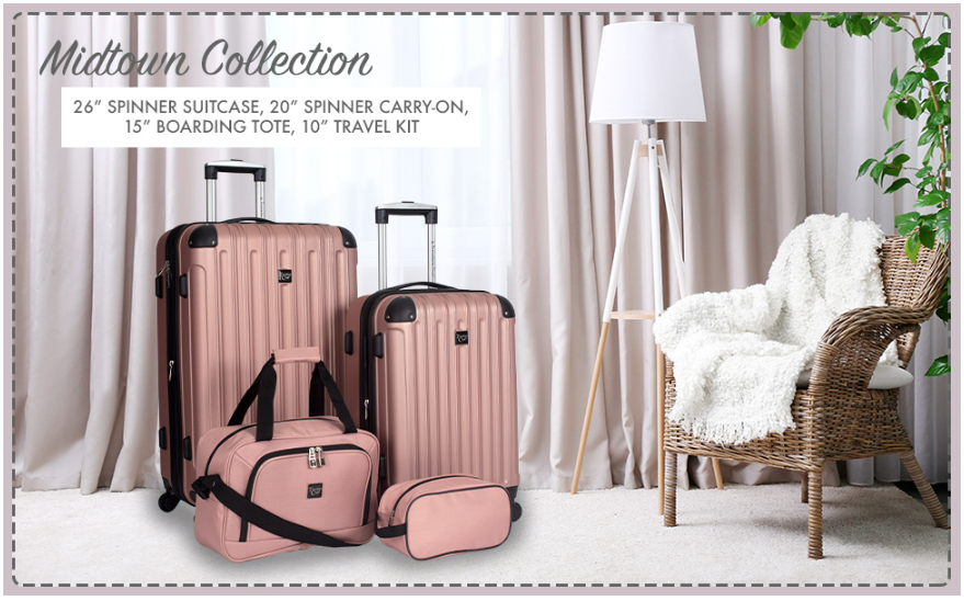 Travelers Club Midtown 4 Piece Luggage Set Includes: 26" Hardside Spinner 4 Wheel Luggage 20" Hardside Spinner Carry On 15" Boarding Tote Bag 10" Toiletry Kit