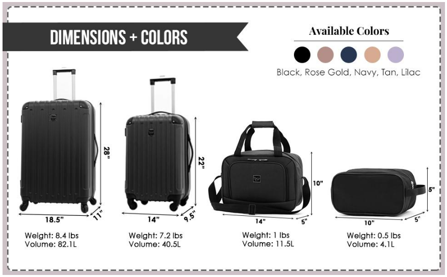 • 20" Carryon spinner luggage: 20" H x 13" L x 9. 5" W, 7. 2 lbs.