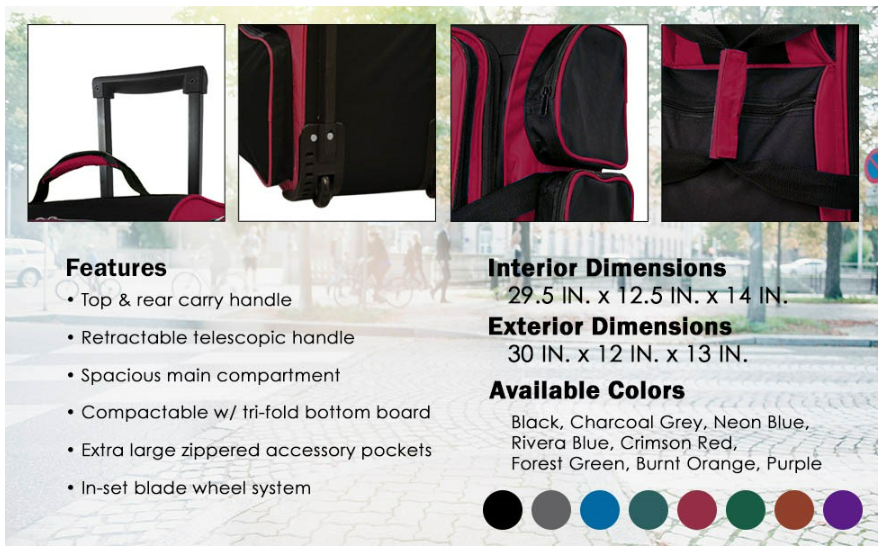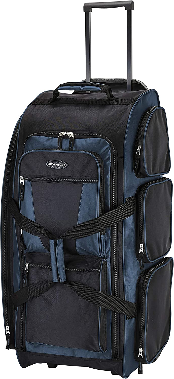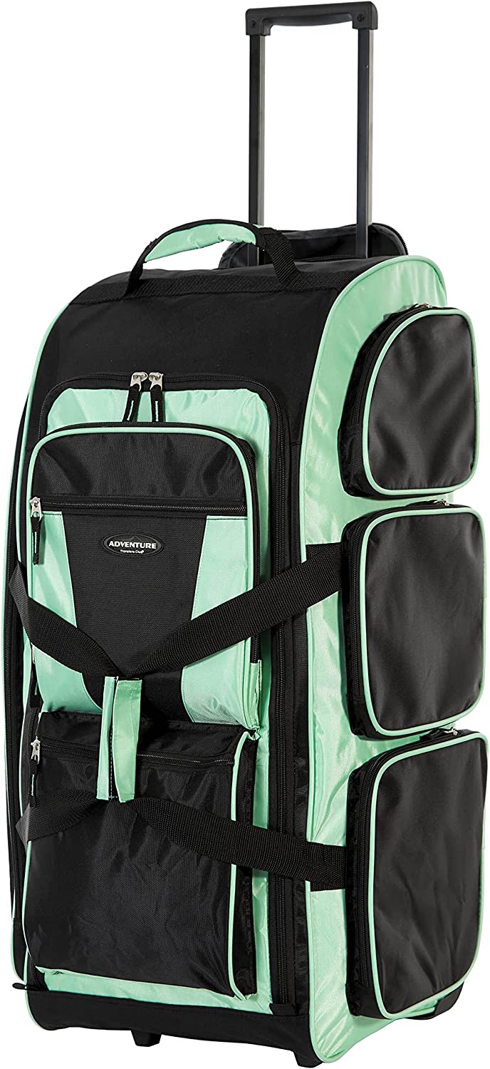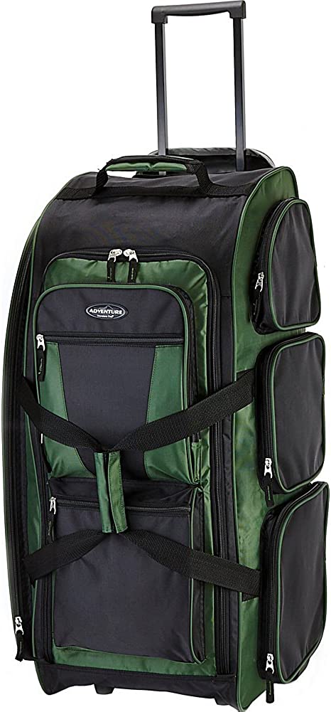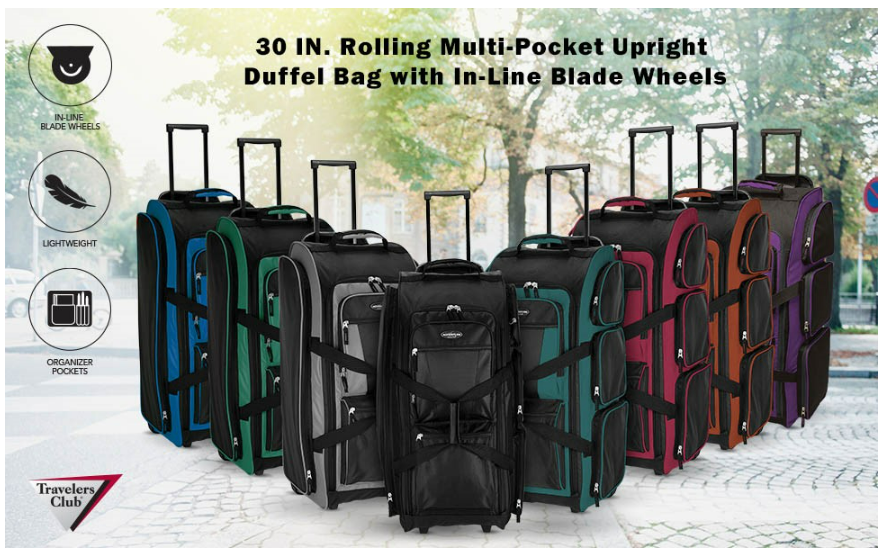 Travelers Club expedition 30" Rolling duffel is constructed from 600D. Polyester. It has large U-shape opening and extra large zippered accessory pockets.