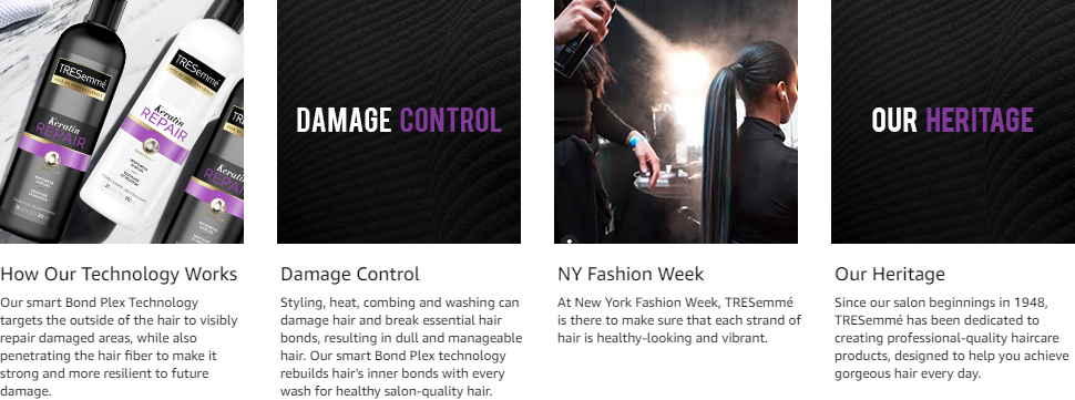 TRESemmé Pro Keratin Repair Shampoo visibly repairs hair from styling and heat damage with smart Bond Plex technology. This smart system works to smooth and shield hair fibers from within for strong, healthy-looking hair that is protected from future damage. Styling, heat, combing and washing can damage hair and break essential hair bonds, resulting in dull and unmanageable hair. Our smart technology penetrates the hair to construct new bonds and strengthen hair from within. To use, Apply a generous amount of the shampoo to wet hair. Massage gently from roots to end to work into a lather. Rinse thoroughly. Follow with TRESemmé Keratin Repair Conditioner. From our origins in salons, we have always been driven by a simple truth: every woman deserves to look fabulous, like they've just stepped out of the salon, without spending a fortune. TRESemmé is dedicated to creating hair care and styling products that are salon quality without the salon price. Great for all hair types, just shampoo in the shower and your hair will feel nourished and ready so that you can take on the day and night with confidence. The TRESemmé mission is to create a disruptive path forward so women can lead the way in life and style.