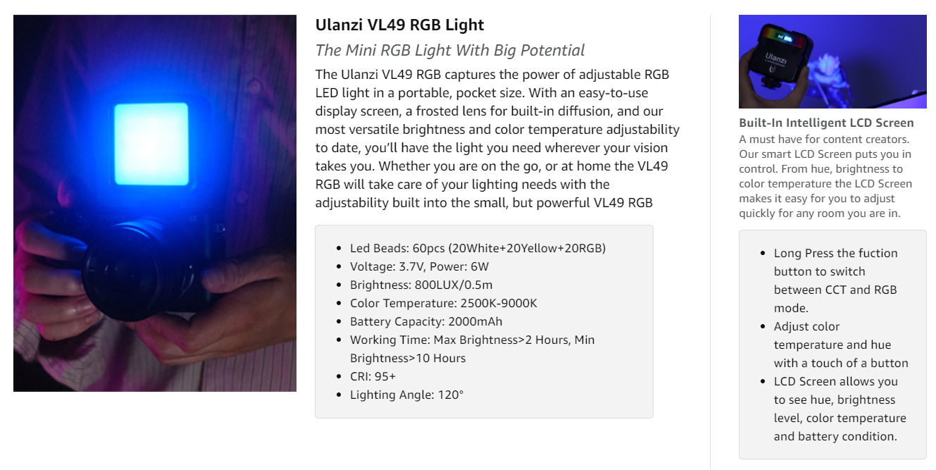【Professional RGB LED Video Lights】The new version VL49 RGB LED video light adopts 60 high color rendering led beads, illumination angle up to 120°, the brightness can reach 800LUX@0.5m, topest CRI95 cab completely with perfect color of sunlight and ensure that its light is natural lifelike. Apply to portrait, children,wedding and new photography etc.