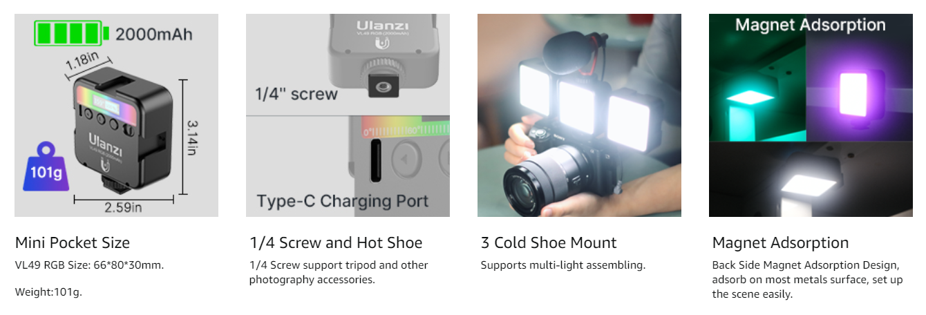 ULANZI VL49 RGB Video Lights, LED Camera Light 360° Full Color Portable Photography Lighting w 3 Cold Shoe, 2000mAh Rechargeable CRI 95+ 2500-9000K Dimmable Panel Lamp Support Magnetic Attraction(7569)