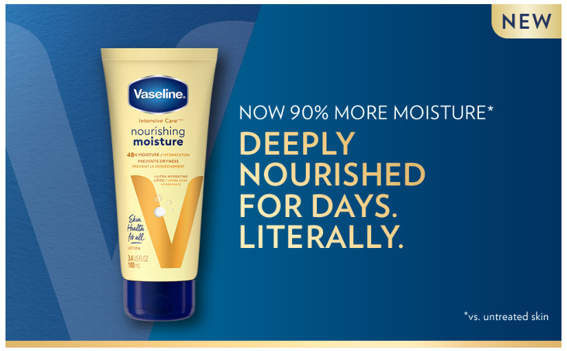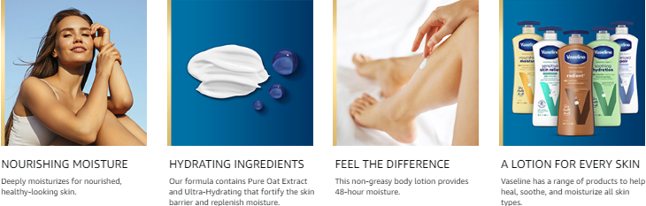 Vaseline Intensive Care Nourishing Moisture Lotion, with Ultra-Hydrating Lipids and Pure Oat Extract, moisturizes and nourishes for healthy-looking skin. This body moisturizer is clinically tested to provide 90% more skin moisture (vs. untreated skin).