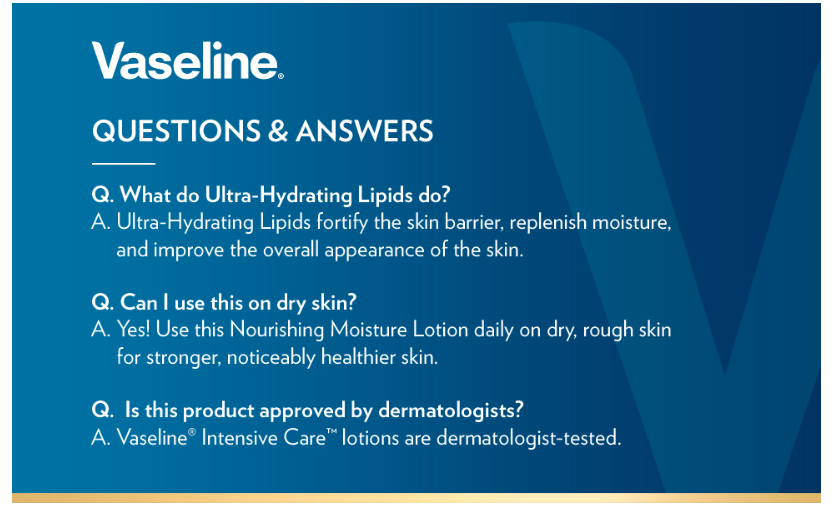 Vaseline Intensive Care Essential Healing is now Vaseline Intensive Care Nourishing Moisture. Vaseline Intensive Care Nourishing Moisture lotion locks in moisture and deeply nourishes for healthy-looking skin. This body lotion is formulated with Pure Oat Extract and Ultra-Hydrating Lipids that fortify the skin barrier and replenish moisture. With daily exposure to environmental triggers (like wind, lack of humidity, and sun), skin's natural moisture barrier can break down, allowing for water to escape the skin. But the Ultra-Hydrating lipids in our lotion fortify the skin barrier and replenish moisture to allow the skin's natural barrier to recover. This lotion locks in moisture and promotes smooth, naturally glowing skin. The body moisturizer is clinically tested to provide 90% more skin moisture (vs. untreated skin). This body lotion for dry skin absorbs fast for rich moisturization without the residue and provides 48-hour moisture. Use this dermatologist-tested body lotion daily on dry, rough skin for stronger, noticeably healthy skin. Just apply to your skin for hydrating relief. This Vaseline lotion bottle is made of 50% recycled plastic. Our ambition is to get to 100% recycled plastic in the near future.