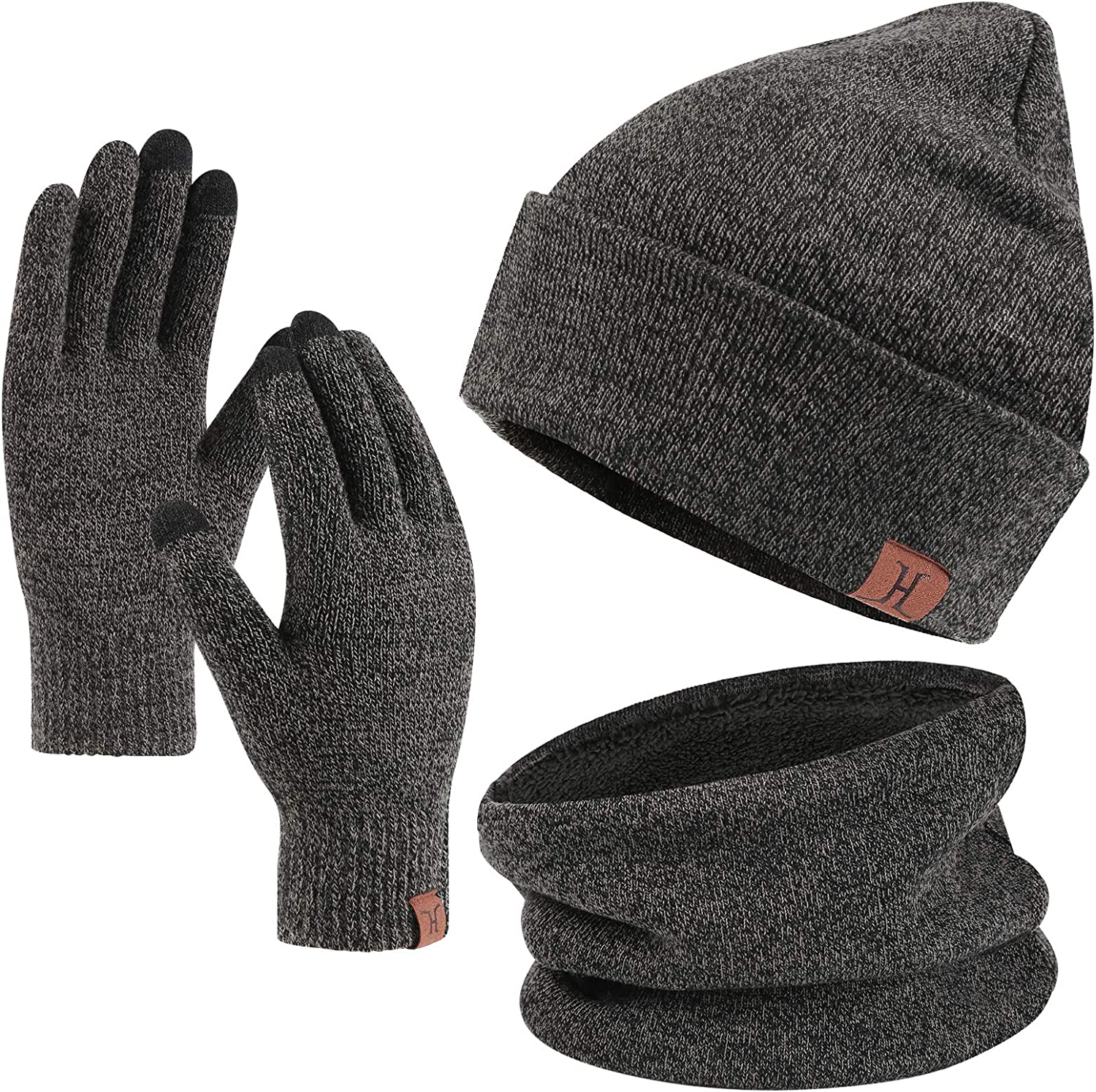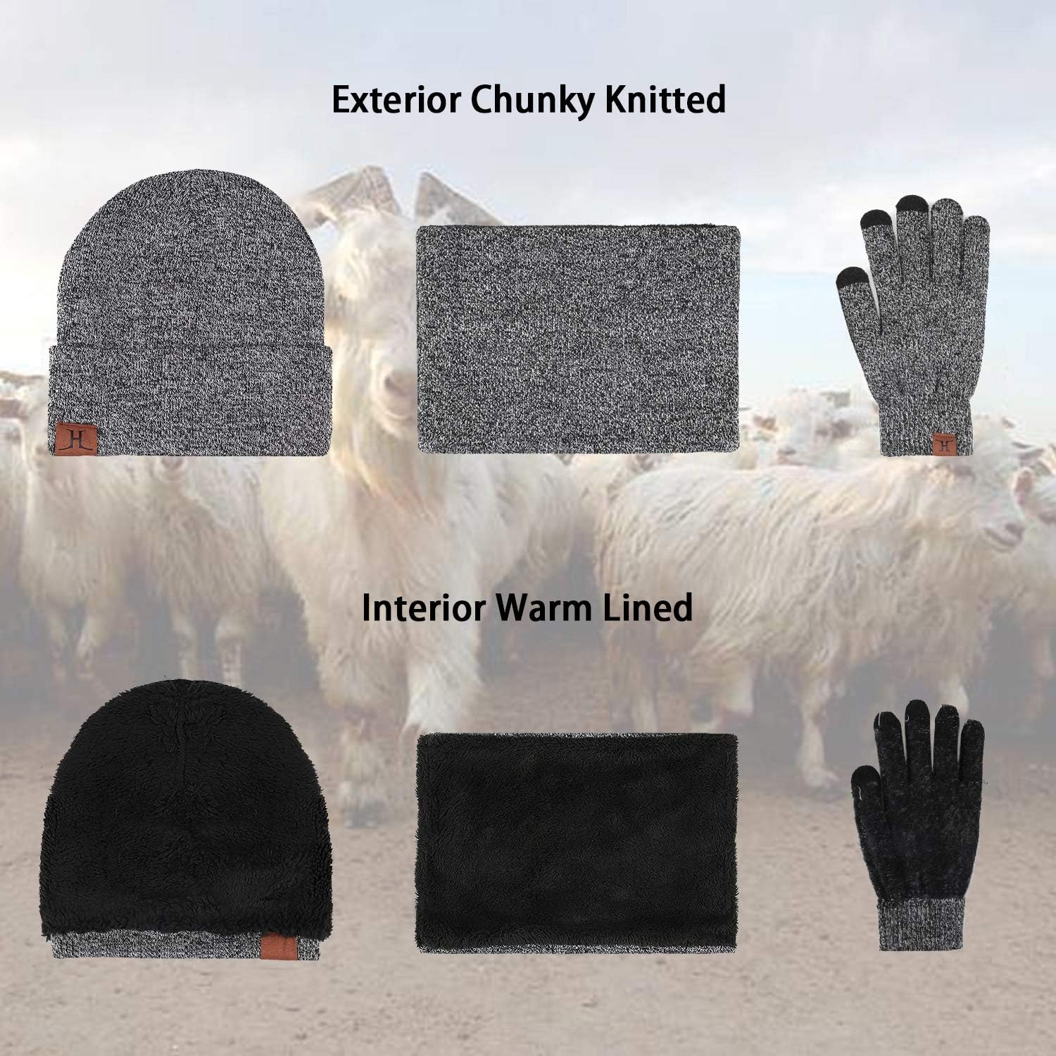 The knitted hat is pretty thick and warm, gloves with touchscreen capability, and a neck warmer that is super thick with a fleece lining that can be pulled up over the face. Durable and versatile for outdoor enthusiasts - Thick and durable winter wear make activities much funnier and comfortable.
