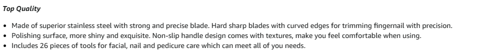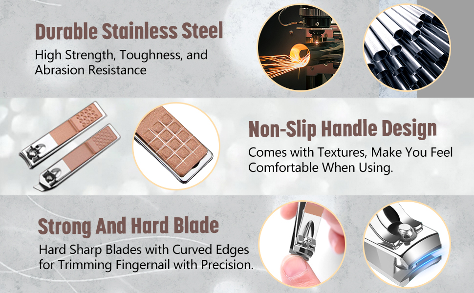 ?【Premium Material】Nail clippers set is made of superior stainless steel with strong and precise blade. Hard sharp blades with curved edges for trimming fingernail with precision.