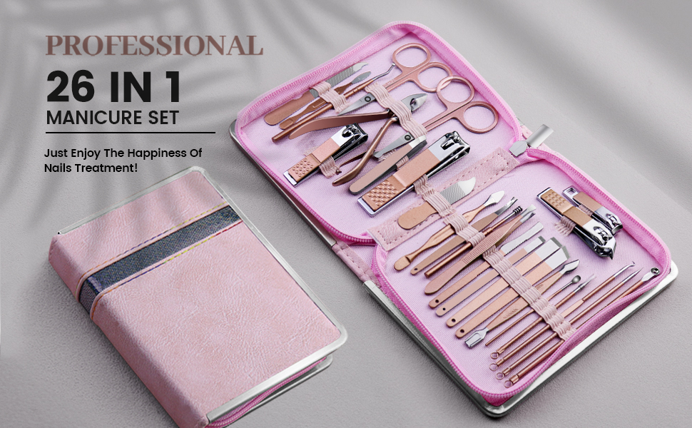 26 in 1 Manicure Set - Professional Manicure Kit Pedicure Kit, Stainless Steel Nail Clippers Set Nail Care Kit with Travel Case Pink(6226)