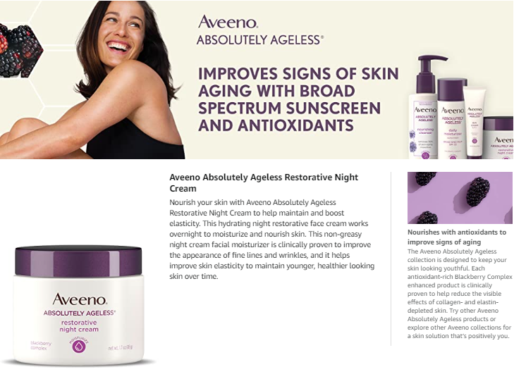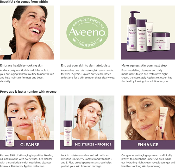 Nourish your skin with Aveeno Absolutely Ageless Restorative Night Cream to help maintain skin's firmness and boost elasticity. This hydrating face and neck cream works overnight to moisturize and nourish for younger, healthier-looking skin over time. Its unique formula is made with antioxidant-rich Blackberry Complex, Vitamin C and Vitamin E, and is clinically proven to improve the appearance of fine lines and wrinkles. This non-greasy night cream facial moisturizer also helps improve skin elasticity and strengthen skin's natural moisture barrier for healthier-looking skin over time. From the brand that has been dermatologist-recommended for over 65 years, it's hypoallergenic and non-comedogenic, so it won't clog pores. The Aveeno Absolutely Ageless collection of skincare products is designed to keep your skin looking youthful. Each product is clinically proven to help reduce the visible effects of collagen and elastin depleted skin.