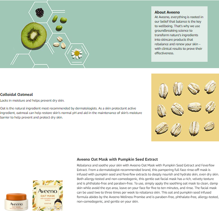 Rebalance and soothe your skin with Aveeno Oat Mask with Pumpkin Seed Extract and Feverfew Extract. From a dermatologist-recommended brand, this pampering full face rinse-off mask is infused with pumpkin seed and feverfew extracts to deeply nourish and hydrate skin, even dry skin. Both allergy-tested and non-comedogenic, this gentle oat facial mask has a rich, velvety texture and is phthalate-free and paraben-free. To use, simply apply the soothing oat mask to clean, damp skin while avoid the eye area, leave on your face for five to ten minutes, and rinse. The facial mask can be used two to three times per week to rebalance skin. This oat and pumpkin seed infused formula abides by the Aveeno Wellness Promise and is paraben-free, phthalate-free, allergy-tested, non-comedogenic, and gentle on your skin.