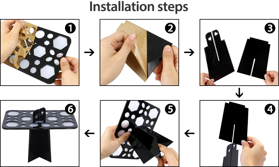 The makeup brush drying rack is made of 3 assembling parts. Firstly, put the two support slots together, and then press the top bracket firmly to the base to form stable support.