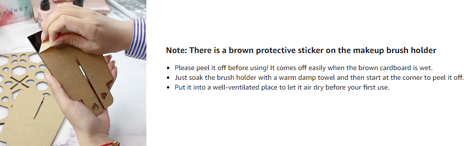 - There is a brown protective sticker on the makeup brush holder. Please peel it off before using! It comes off easily when the brown cardboard is wet. Just soak the brush holder with a warm damp towel and then start at the corner to peel it off.