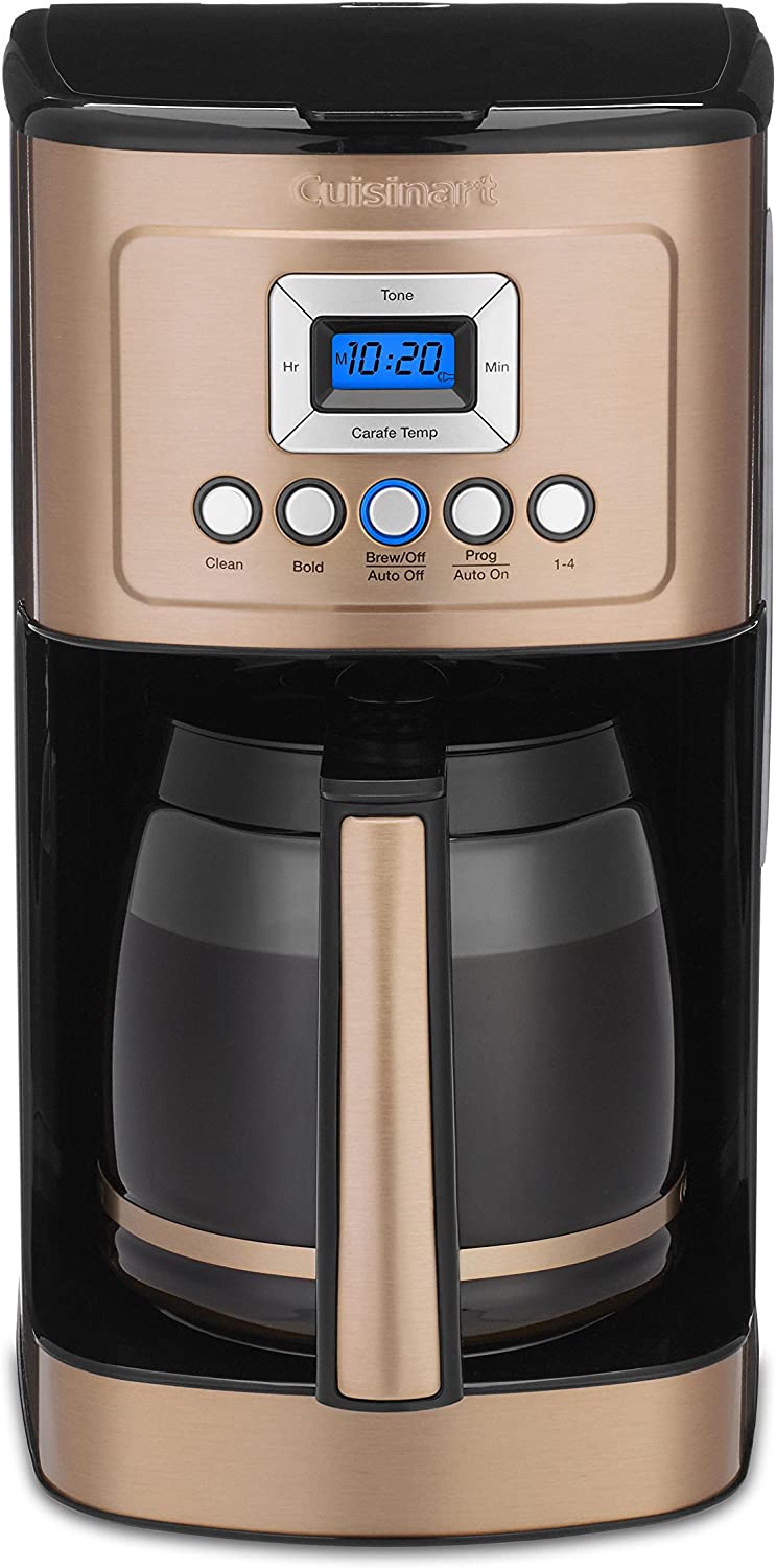 Turn up the flavor and the temperature on your coffee with the Cuisinart 14 Cup Programmable Coffeemaker! Using our cutting edge coffee technology, the 14 Cup Programmable Coffeemaker can give you hotter coffee without sacrificing taste. Choose a regular or bold flavor profile and set the brew-time up to 24 hours ahead so your next cup is ready when you are. The backlit LCD is easy-to-read, a ready tone can be turned on or off, and an indicator light signals when it’s time to decalcify. Refer to the user manual for troubleshooting steps. Features: Hotter Coffee with expert coffee-making technology to ensure hotter coffee temperature without sacrificing flavor or quality|Brew Strength Control allows you to select Regular or Bold coffee flavor|Fully Automatic with 24 hour programmability self clean 1–4 cup setting auto-off (0–4 hours) and optional ready alert tone|14 Cup Glass Carafe with decorative stainless steel handle|Easy-to-View Water Window for accurate filling Brew Pause™ feature lets you enjoy a cup of coffee before the brewing cycle has finished 60-Second Reset recalls settings and position in the brewing process in case of loss of power|Gold-Tone Coffee Filter and Charcoal Water Filter|Limited 3-Year Warranty