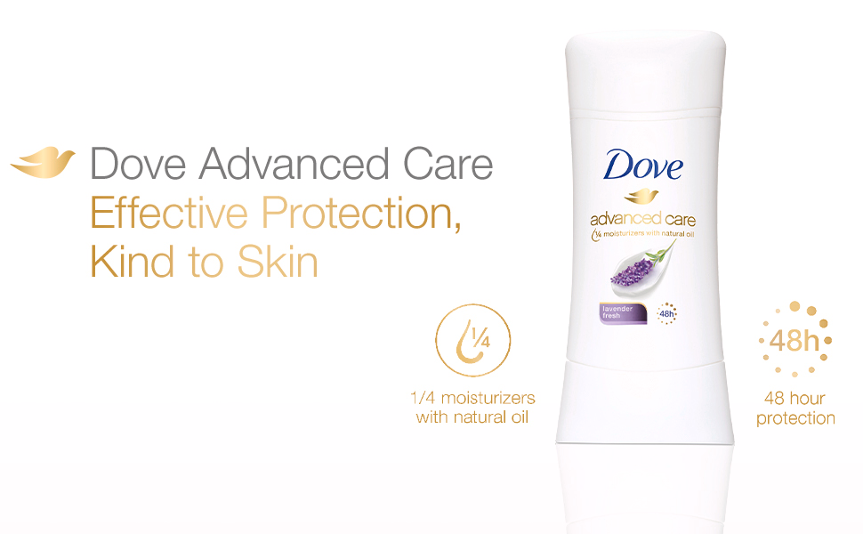 Long-lasting antiperspirant protection, gentle skin care, and a fresh, lavender scent – who says you can’t have it all? Start your day with Dove Advanced Care Lavender Fresh Antiperspirant deodorant.Stick. Enriched with our signature 1/4 moisturizers with natural oil, this antiperspirant stick leaves you with soft, comfortable underarms. Made with a kind-to-skin formula and containing 0 percent alcohol (ethanol), it helps delicate skin recover from underarm irritation caused by shaving. Use this antiperspirant deodorant.regularly to enjoy comfortable and healthy-feeling underarms. Keeping you fresh all day, this gentle antiperspirant for women protects from sweat and odor for up to 48 hours. If you’ve been wondering how to get soft, comfortable underarms. choose our antiperspirant stick and enjoy beautifully fresh underarms.that stay dry all day long. For best results, apply this Dove antiperspirant deodorant.to dry skin after showering and enjoy fresh, comfortably dry skin from morning to night. Dove is certified cruelty-free by PETA because we believe that real beauty is cruelty-free. We’re on a mission to help women raise their self-esteem – because we believe beauty should be a source of confidence, not anxiety. Dove Antiperspirant deodorant. deliver effective underarm protection and are kind to skin, so women can be free of underarm inhibitions and live beautifully unselfconsciously.