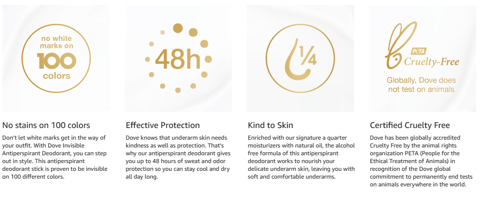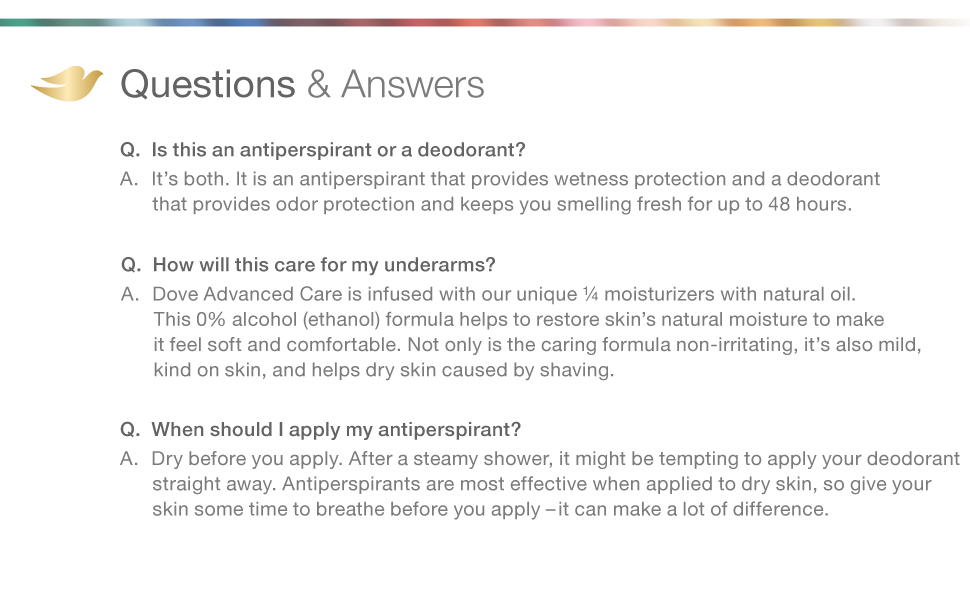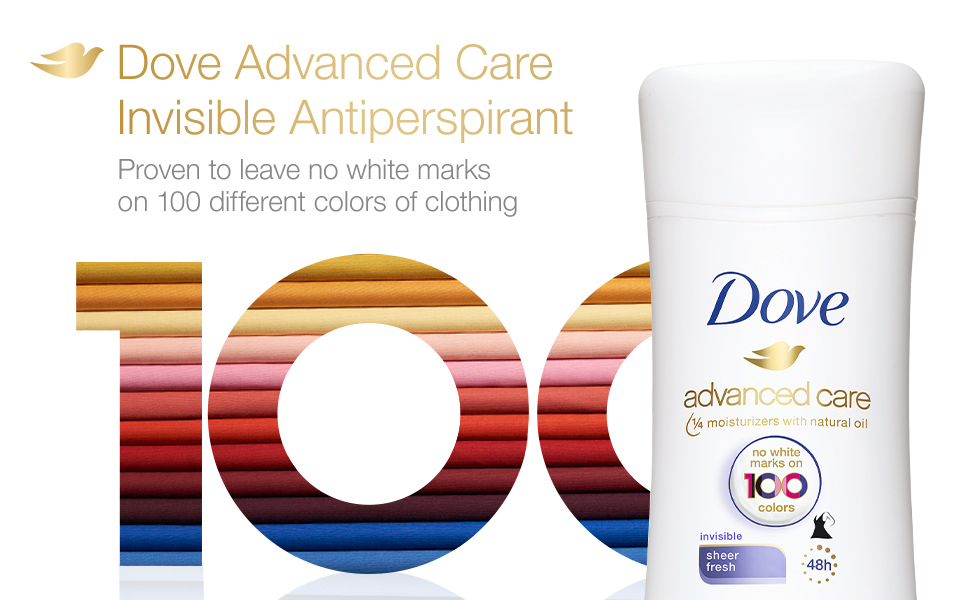 With Dove Advanced Care Invisible Sheer Fresh Antiperspirant Deodorant Stick, you can step out in style. This antiperspirant deodorant for women is proven to be invisible on 100 colors of clothing. Giving you long-lasting protection against underarm sweat and odor, this non-irritating antiperspirant for women will leave your underarms feeling healthy and protected for up to 48 hours. Enriched with our signature 1/4 moisturizers with natural oil, this antiperspirant gives you a dose of underarm care. Its 0 percent alcohol (ethanol) formula helps reduce irritation from shaving and leaves you with the fresh scent of cucumber with notes of freesias, lily and rose. Use Dove women's deodorant regularly and you can enjoy beautifully soft and comfortable underarms that stay dry all day long. For best results, swipe your antiperspirant deodorant stick up and down each underarm until an even layer is applied. Apply this Dove antiperspirant deodorant to dry skin after showering and enjoy fresh, comfortably dry skin from morning to night. Dove is certified cruelty-free by PETA because we believe that real beauty is cruelty-free. We’re on a mission to help women raise their self-esteem – because we believe beauty should be a source of confidence, not anxiety. Dove Antiperspirant Deodorants deliver effective underarm protection and are kind to skin, so women can be free of underarm inhibitions and live beautifully unselfconsciously.