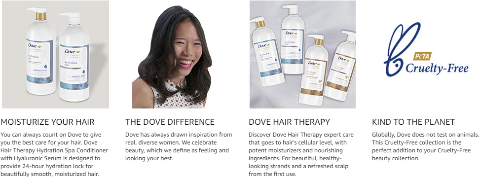 If you’re searching for smooth, moisturized hair, look no further. After using our Hair Therapy Hydration Spa Shampoo, treat yourself to a mini spa day in the comfort of your home with our Hydration Spa Conditioner for a dose of hair hydration. Specially created to give dry hair the care it deserves, this nourishing conditioner is formulated with our 24-hour hydration lock technology to keep hair hydrated for longer. Infused with hyaluronic serum, it helps to give you a boost of hair hydration and leaves you with healthy-looking locks wash after wash, when used with our Hydration Spa Shampoo. Plus, it’s infused with potent moisturizers and nourishing ingredients that target your hair on a cellular level* – leaving it soft, smooth and beautifully hydrated. And that’s not all, it leaves your scalp feeling refreshed and vitalized, too. Simply smooth this hydrating conditioner on after using our Hydration Spa Shampoo and enjoy a spa-like treatment every time you shower. Perfect for: Expert hair care : Dreaming of a smooth hair conditioner that can work wonders? This hair smoothing conditioner blends all the care of Dove with expert know-how to nourish your hair at a cellular level* with potent moisturizers and nourishing ingredients. Hair hydration: Formulated with hyaluronic serum, this hydrating conditioner uses our 24-hour hydration lock technology to keep hair hydrated all day long, when used alongside our Hydration Spa Shampoo. A spa-like experience: Wondering how to make hair look healthy? Treat it to a spa-like experience. This gentle, paraben-free conditioner for dry hair works to leave you with nourished, healthy- looking hair and a refreshed scalp – all from the comfort of your home. Cruelty-free hair care: Globally, Dove does not test on animals. Our Hair Therapy Hydration Spa range carries the PETA cruelty-free logo for added peace of mind. How to use: After shampooing with Hair Therapy Hydration Spa Shampoo, apply this hydrating conditioner from the mid lengths to tips and massage it in. Take a moment to enjoy your conditioner (for smooth hair and a spa-like experience leave it on a little longer), then rinse away. *Nourishes at the level of the hair cortex