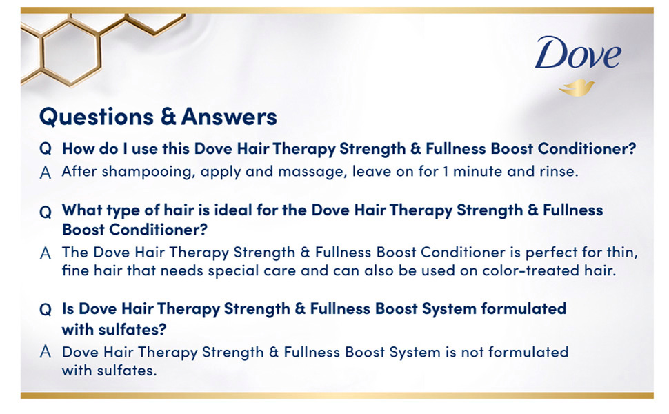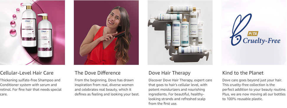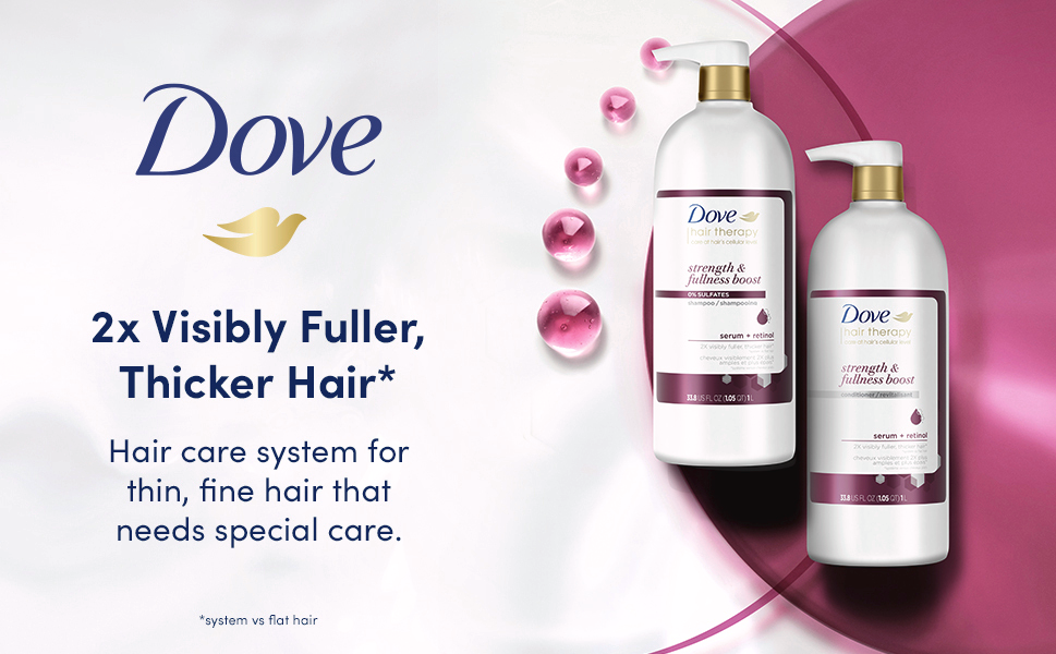 Perfect for fine hair that deserves extra care. Dove Hair Therapy Strength and Fullness Boost Shampoo and Conditioner System is designed with serum and retinol, which strengthen hair from root to tip and instantly restore hair fullness. This sulfate-free system features potent moisturizers and nourishing ingredients that deliver 2X visibly fuller, thicker hair*.