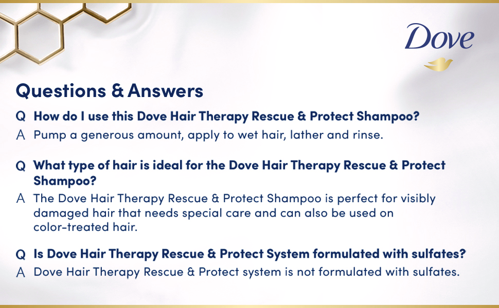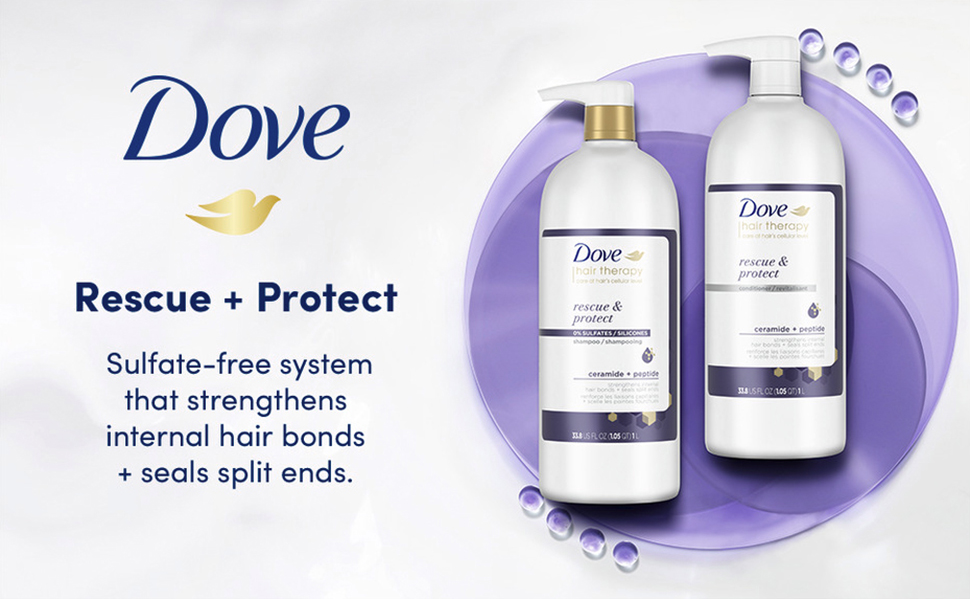 Dove Hair Therapy Rescue & Protect Shampoo and Conditioner System is formulated with ceramide and peptide, which strengthens internal hair bonds, seals split ends, and protects hair from eat damage and breakage. This sulfate-free system features potent moisturizers and nourishing ingredients for beautifully strong and healthy hair.