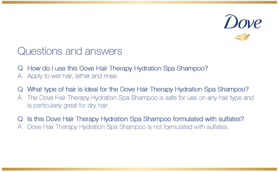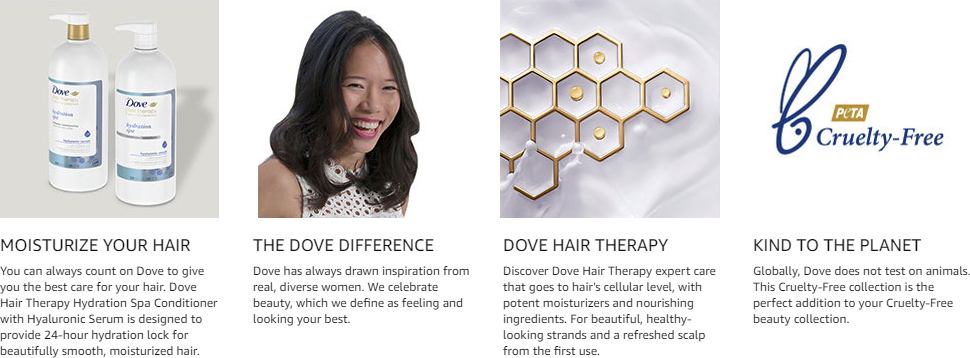Wondering how to get soft, smooth hair? Shampoo plays a big part in how your hair looks and feels – and we’ve got just the thing. Treat your hair to a spa day from home and give it the nourishment it deserves with Dove Hair Therapy Hydration Spa Shampoo and Conditioner. Perfect for a dose of hair hydration, this hydrating shampoo for dry hair is formulated with hyaluronic serum to keep your hair feeling beautifully soft, smooth and nourished when used alongside our Hydration Spa Conditioner. And that’s not all, it leaves your scalp feeling refreshed, too. Specially created to care for your hair at a cellular level*, this moisturizing shampoo is made with potent moisturizers and nourishing ingredients. When used with our Hydration Spa Conditioner, it helps you give your hair the care it needs, exactly where it needs it. Plus, if you’re looking for a shampoo to moisturize hair, our 24-hour hydration lock does just that. Simply smooth it on and enjoy a spa-worthy treatment every time you shower. Perfect for: Expert hair care: Our Hydration Spa Shampoo works at your hair’s cellular level*, using expert care to keep hair moisturized. Formulated with hyaluronic serum and potent moisturizers, you’ll be left with hair that feels soft, smooth and nourished after just one wash, when used with our Hydration Spa Conditioner. Hair hydration: This hydrating shampoo uses 24-hour hydration lock technology to keep hair moisturized all day long, so dryness can become a thing of the past. A spa-like experience: Our Hydration Spa Shampoo blends expert care with the gentle Dove formulas you know and love to leave you with nourished, healthy-looking hair and a refreshed scalp – all from the comfort of your home. Cruelty-free hair care: Globally, Dove does not test on animals. Our Hair Therapy Hydration Spa range carries the PETA cruelty-free logo for added peace of mind. How to use: Enjoy this shampoo as part of your shower routine.