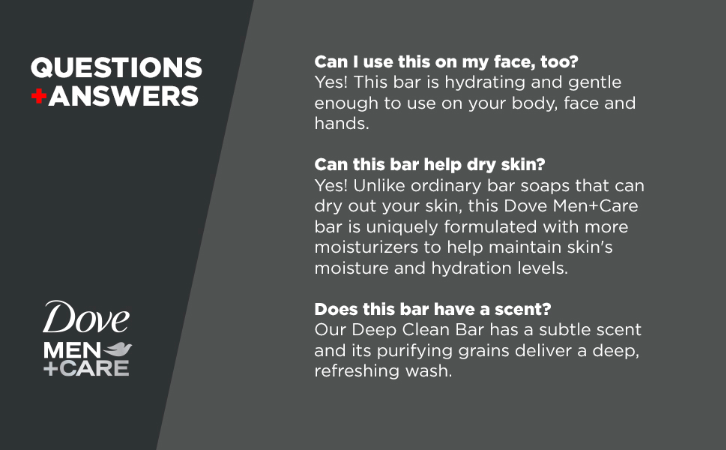 Looking for a bar soap for men that cleanses while also helping protect from dry skin? Dove Men+Care Deep Clean Body and Face Bar contains purifying grains and delivers a deep, refreshing clean that leaves skin feeling hydrated and strong. Dove Men+Care Body and Face Bar effectively washes away bacteria, nourishes your skin. Body and face soap bar goes beyond just delivering a deep clean: it helps to protect skin from feeling tight and dry with its unique formula made for men’s skin. With ¼ moisturizing cream, the Dove Men+Care Deep Clean Body and Face Bar nourishes for skin that feels healthy and strong. This #1 Dermatologist Recommended body soap and face soap bar helps to maintain skin’s hydration levels and protect skin against dryness. Regular men’s bar soap can often leave skin feeling tight and dry, but Dove Men+Care Deep Clean Body and Face Bar helps maintain skin’s moisture to provide skin comfort and refreshment. Plus, its formula is non-comedogenic and mild and gentle enough to use on your face. To use Dove Men+Care Deep Clean Body and Face Bar, wet the body bar in the shower and massage into your face and body to create a light foam before rinsing thoroughly. The lather rinses cleanly away without leaving behind a greasy feel. Dove Men+Care Deep Clean Body and Face Bar has a classic scent, and is clinically proven to fight skin dryness. This body bar not only cleanses, but also leaves your skin feeling healthy and strong.