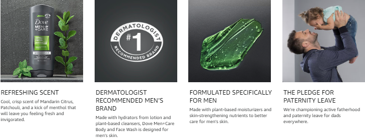 Dove Men+Care Extra Fresh Body and Face Wash is specifically designed for men's skin to leave it hydrated and comforted. Our body wash is powered by MicroMoisture Technology and formulated with plant-based moisturizers and skin-strengthening nutrients to rebuild and strengthen skin.