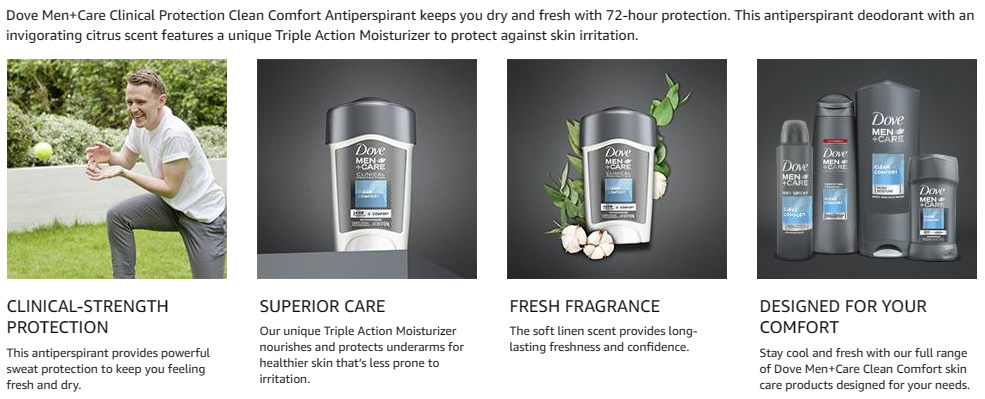 Dove Men+Care Clinical Protection Clean Comfort Antiperspirant Stick gives you 96h sweat protection while caring for sensitive skin. This antiperspirant stick is formulated with 1/4 Moisturizing Cream to help retain skin moisture and help protect against irritation for more comfortable underarms. This Clinical Strength antiperspirant features a long-lasting subtle fragrance to keep you feeling fresh and confident all day. Simply apply this clinical strength antiperspirant in an even layer onto each of your underarms to help soothe and protect your underarms from sweat and odor for lasting confidence around the clock. Looking for more Dove Men+Care skin care products? Try the full range of Dove Men+Care products, including antiperspirant deodorants, dry spray antiperspirant deodorants, body washes, face and body bars, and other hair and skin care products. Each Dove Men+Care antiperspirant stick can be recycled. Follow the How2Recycle instructions on the back. All Dove products, including this antiperspirant deodorant, are PETA-certified cruelty-free. Globally, Dove does not test on animals.