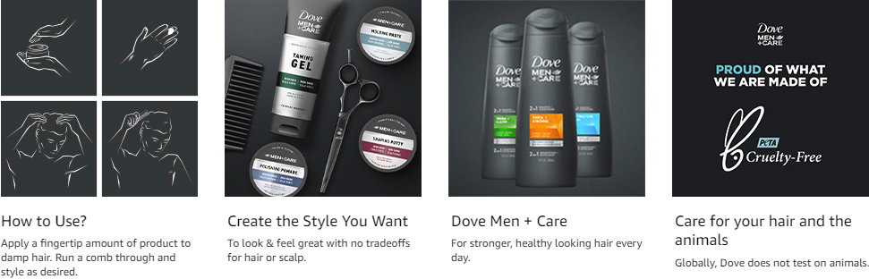 Dove Men+Care Styling Hair Product Aids are engineered specifically for men’s hair, giving it a stronger and more resilient style so that it can keep up with men’s active lifestyles, no matter what the day brings. Dove Men+Care Sculpting Hair Paste creates textured styles with a matte finish that can be reshaped and restyled throughout the day. It's the perfect hair styling product for active men who desire a natural, textured look combined with a medium hold and a matte finish. It provides the finishing touch to a great hair care men's grooming routine so that men can look and feel their best throughout the day. Dove Men+Care Sculpting Paste is designed for daily use and is small enough to travel with you daily. Don’t forget that great hair care starts in the shower! Use the Dove Men+Care Haircare regimen for the best effect. The Control Gel goes well with any of the Dove Men+Care Shampoos and Fortifying 2-in-1 Shampoo + Conditioners, including Thick and Strong Fortifying 2-in-1. Use it with the entire line of Dove Men+Care products for the perfect grooming regimen, such as Dove Men+Care Cool Fresh, Extra Fresh or Clean Comfort Body Wash, Dove Men+Care Dry Spray Antiperspirant, and Dove Men+Care Extra Fresh or Clean Comfort Antiperspirant Stick.