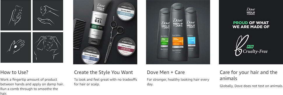 Dove Men+Care Hair Styling Aids are engineered specifically for men’s hair, giving it a stronger and more resilient style so that it can keep up with men’s active lifestyles, no matter what the day brings. Dove Men+Care Hair Taming Gel creates controlled, smooth, wet-look styles with a hold that lasts throughout the day. It's the perfect hair styling gel for active men or any man who desires a wet look combined with a high hold and a smooth, sleek finish, all in an alcohol-free formula. Dove hair products provide the finishing touch to a great hair care men's grooming routine so that men can look and feel their best throughout the day. Don’t forget that great hair care starts in the shower! Use the Dove Men+Care Hair care regimen for the best effect. This Taming Gel goes well with any of the Dove Men+Care Shampoos and Fortifying 2-in-1 Shampoo + Conditioners, including Fresh and Clean 2-in-1. Use it with the entire line of Dove Men + Care products for the perfect grooming regimen, such as Dove Men+Care Extra Fresh or Clean Comfort Body Wash, Dove Men+Care Dry Spray Antiperspirant, and Dove Men + Care Extra Fresh or Clean Comfort Antiperspirant Stick.