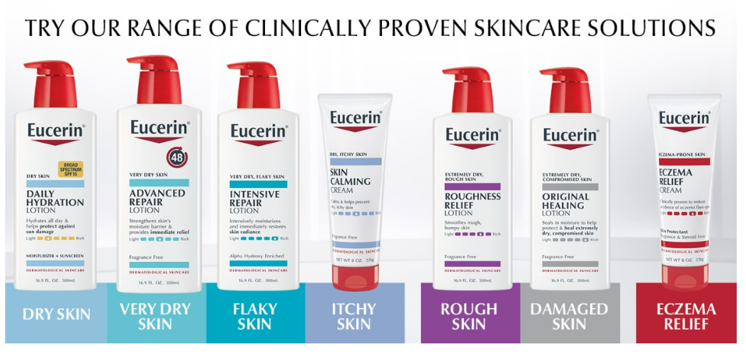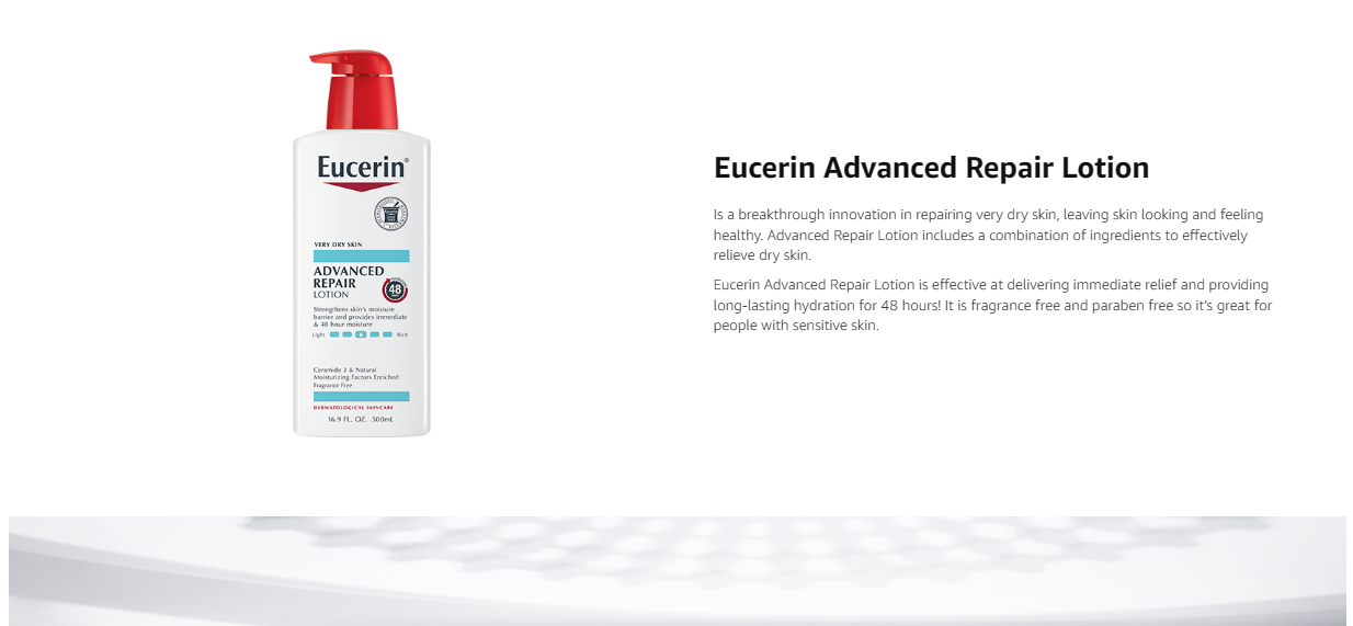 Fight dryness at its source with Eucerin Advanced Repair Body Lotion. This Eucerin lotion for dry skin provides 48 hour moisture for skin that looks and feels healthy. Eucerin Advanced Repair Body Lotion for dry skin is formulated with ceramides to help strengthen the skin’s moisture barrier to lock in moisture. It is also formulated with Natural Moisturizing Factors, amino acids that are naturally found in the skin, to boost moisture and help prevent dryness. This Eucerin sensitive skin lotion formula is lightweight and fast-absorbing, and smoothes, repairs and hydrates dry skin. This Eucerin body lotion for sensitive dry skin is fragrance free, dye free, paraben free. This body moisturizer can also be used as a hand lotion or foot lotion. To use, smooth this Eucerin dry skin lotion onto your skin daily. For best results, apply after showering. Eucerin is a dermatologist-recommended skincare brand that is based on an uncompromising approach to science. With skin care products designed to restore and sustain healthy-looking skin, families everywhere look to Eucerin to enhance outer beauty and self-confidence.