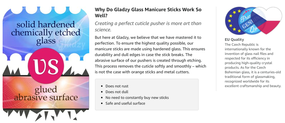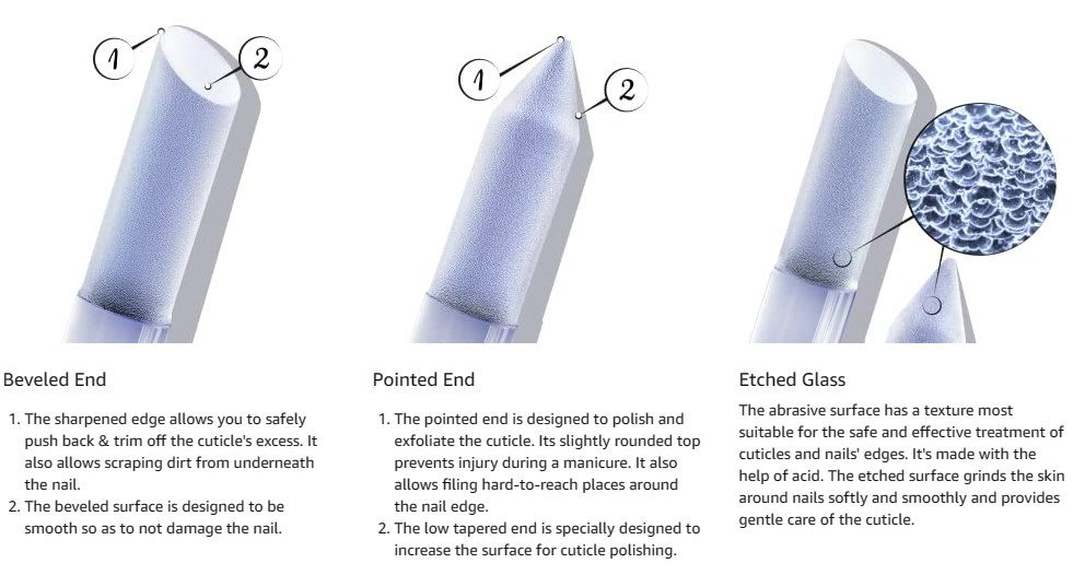 LIFETIME GUARANTEE - Effective filing surface allows for precision shaping. Each cuticle pusher comes with a lifetime guarantee which covers the filing surface. All glass cuticle pushers we sell are chemically hardened which greatly increases their mechanical resistance.