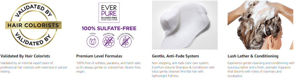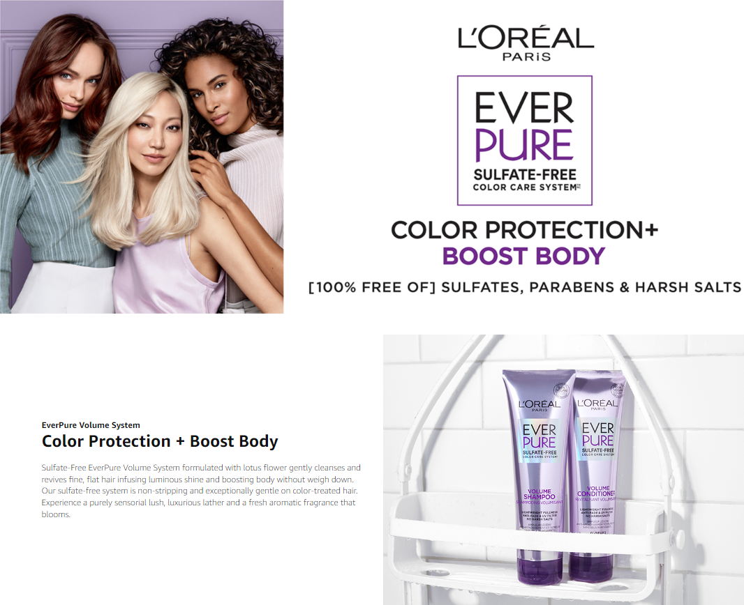 L'Oreal Paris EverPure Volume sulfate free shampoo and conditioner with lotus flower is lightweight and revives fine hair and flatness with lasting body. Keeps color pure up to 4 weeks. Our formulas are especially gentle on color treated hair. There are no harsh sulfates, salts or surfactants that can strip, dull and damage hair. Experience a purely sensorial lush, luxurious lather and a fresh aromatic fragrance that blooms.