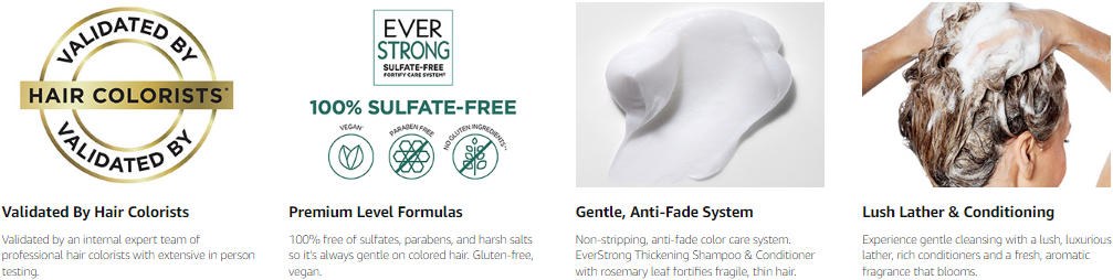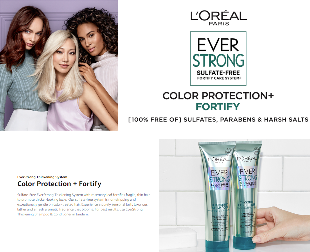L’Oreal Paris EverStrong Thickening sulfate free shampoo and conditioner hydrates and fortifies fine hair for thicker looking hair after the 1st wash. The system injects strength, reinforcing hair to be 15X stronger*. Strengthening Rosemary leaf leaves thin hair looking full and healthy. Our formulas are especially gentle on color treated hair. There are no harsh sulfates, salts or surfactants that can strip, dull and damage hair. Experience a purely sensorial lush, luxurious lather and a fresh aromatic fragrance that conditions.