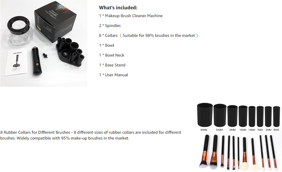 8 Rubber Collars Different Brushes - 8 different sizes of rubber collars are included for different brushes (Diameter: 3mm, 5mm, 7mm, 10mm, 15mm, 18mm, 24mm, 30mm). Widely compatible with 95% make-up brushes in the market