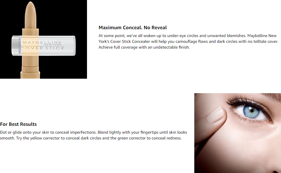 Completely conceals blemishes, dark circles and other imperfections. Waterproof formula lasts for hours. Glides on smoothly and blends in perfectly for natural coverage. Dermatologist tested. Match your skin tone or choose from color corrective shades: yellow corrects dark circles, green corrects redness.