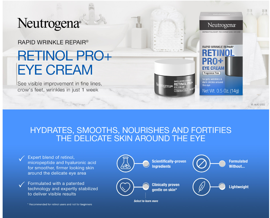 Neutrogena Rapid Wrinkle Repair Retinol Pro+ Eye Cream targets wrinkles & dark circles around the eyes. This cream from a dermatologist-recommended brand is clinically- & ophthalmologist-tested & features a retinol formula boosted with a patented technology for results. The skin firming cream also contains micropeptide to complement the retinol & target the visible effects of collagen-depleted skin. The anti-aging moisturizer targets wrinkles & dark circles & provides smoother, more hydrated skin instantly. See the improved look of crow's feet & elasticity in just 1 week, & the improved look of dark circles in 4 weeks. Hypoallergenic & suitable for all skin types, the cream is formulated to be fragrance-, paraben-, mineral oil-, dye- & phthalate-free. Neutrogena Rapid Wrinkle Repair Retinol Pro+ Eye Cream makes a great addition to your daily anti-aging beauty & skin care routine for at-home self-care. To use, apply a small amount at night around the eye & gently massage into skin.