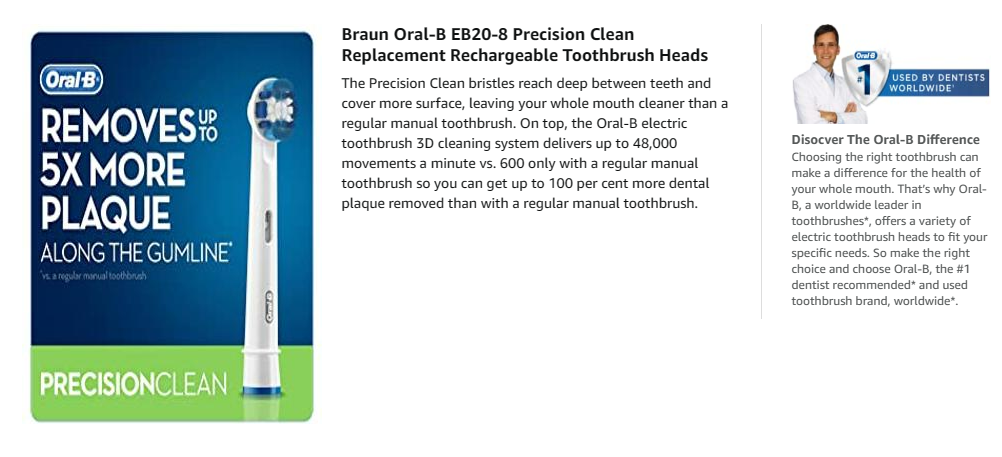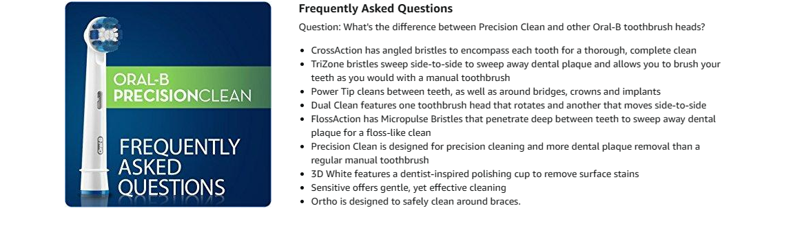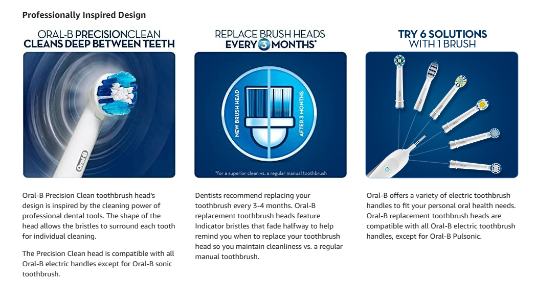 The Oral-B Precision Clean replacement electric toothbrush head bristles reach deep between teeth and cover more surface, leaving your whole mouth cleaner than a regular manual and power away up to 100 percent more plaque for a superior clean vs. a regular manual toothbrush. The brush heads in this refill pack are compatible with Oral-B Genius 8000, 9000. Compatible with Oral-B PRO 600, 650, 1000, 2000, 2500, 3000, 4000, 4900, 5000, 6000, 6500, 7000. Compatible with all Oral-B Vitality and Vitality Plus Variants. Each order comes with 4x Oral-B Precision Clean Electric Replacement Toothbrush Heads.
